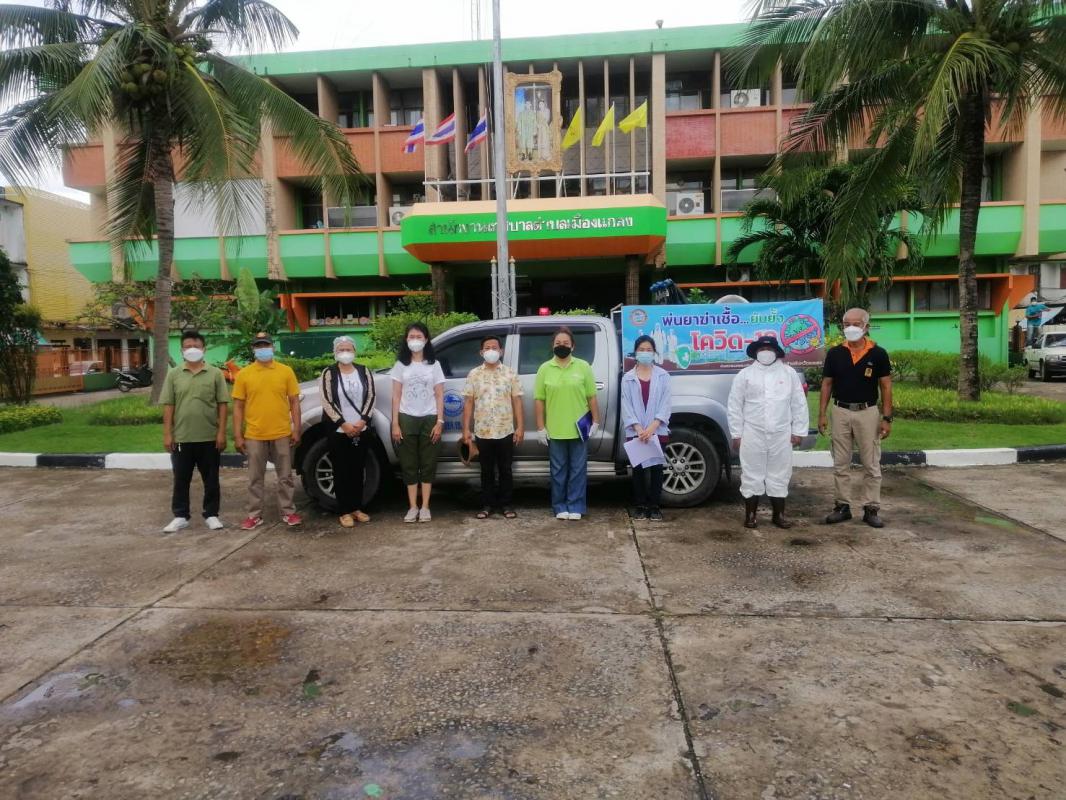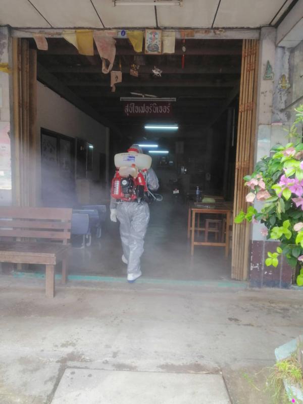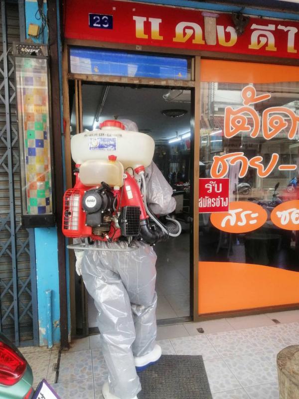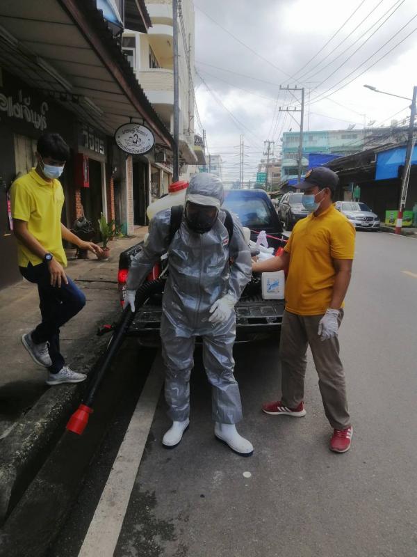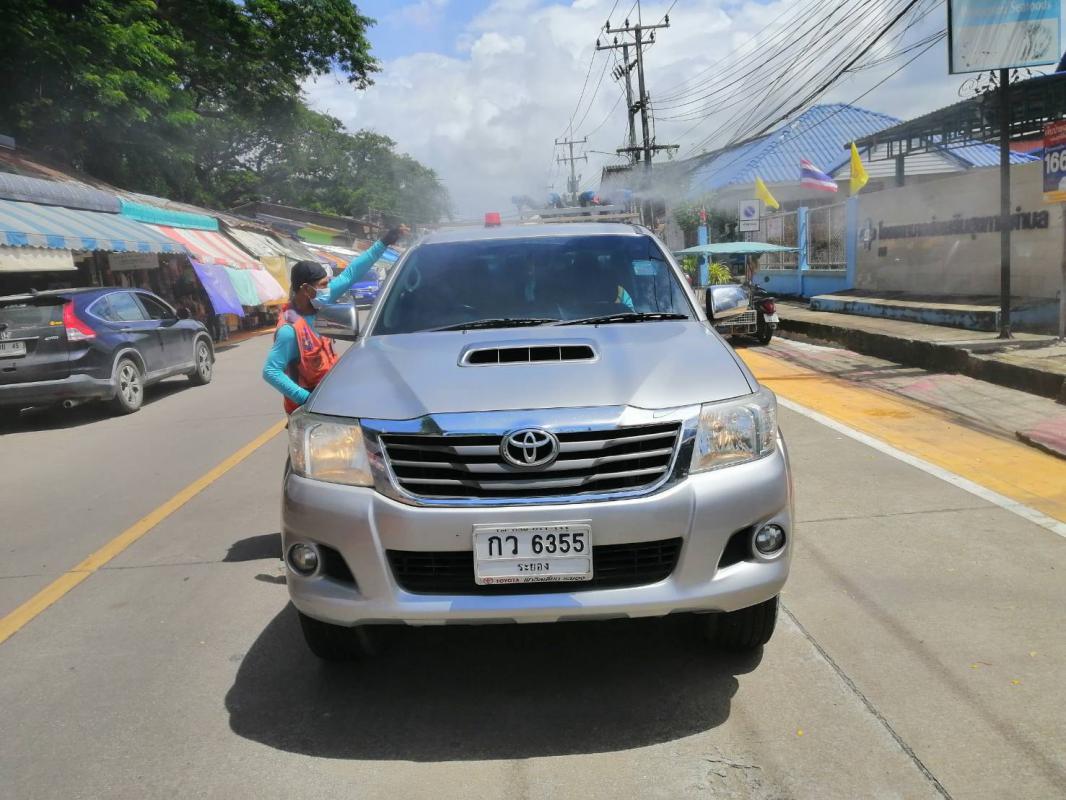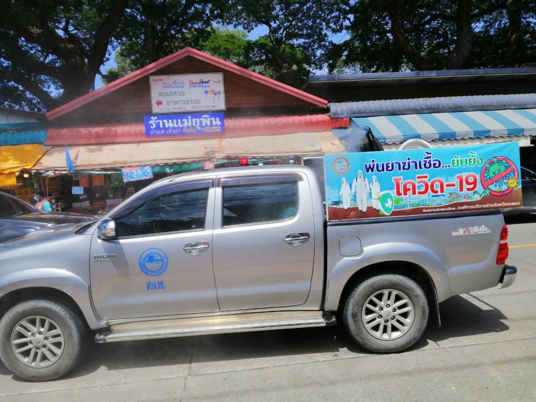 ฉีดพ่นน้ำยาฆ่าเชื้อ โควิด-19 โดยฝ่ายป้องกันและบรรเทาสาธารณภัย อบจ.ระยอง บริเวณตลาดบ้านเพและเขตอ.แกลง