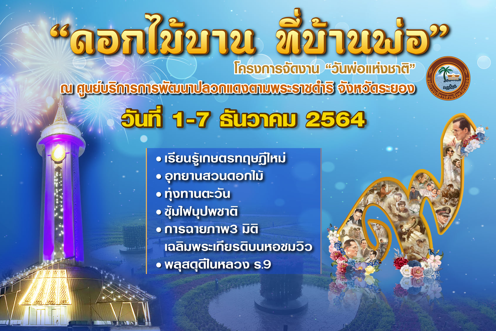 องค์การบริหารส่วนจังหวัดระยอง ขอเชิญร่วมโครงการจัดงานวันพ่อแห่งชาติ ในชื่องาน “ดอกไม้บาน ที่บ้านพ่อ” ในระหว่างวันที่ 1 – 7 ธันวาคม 2564 ณ ศูนย์บริการการพัฒนาปลวกแดงตามพระราชดำริ จังหวัดระยอง