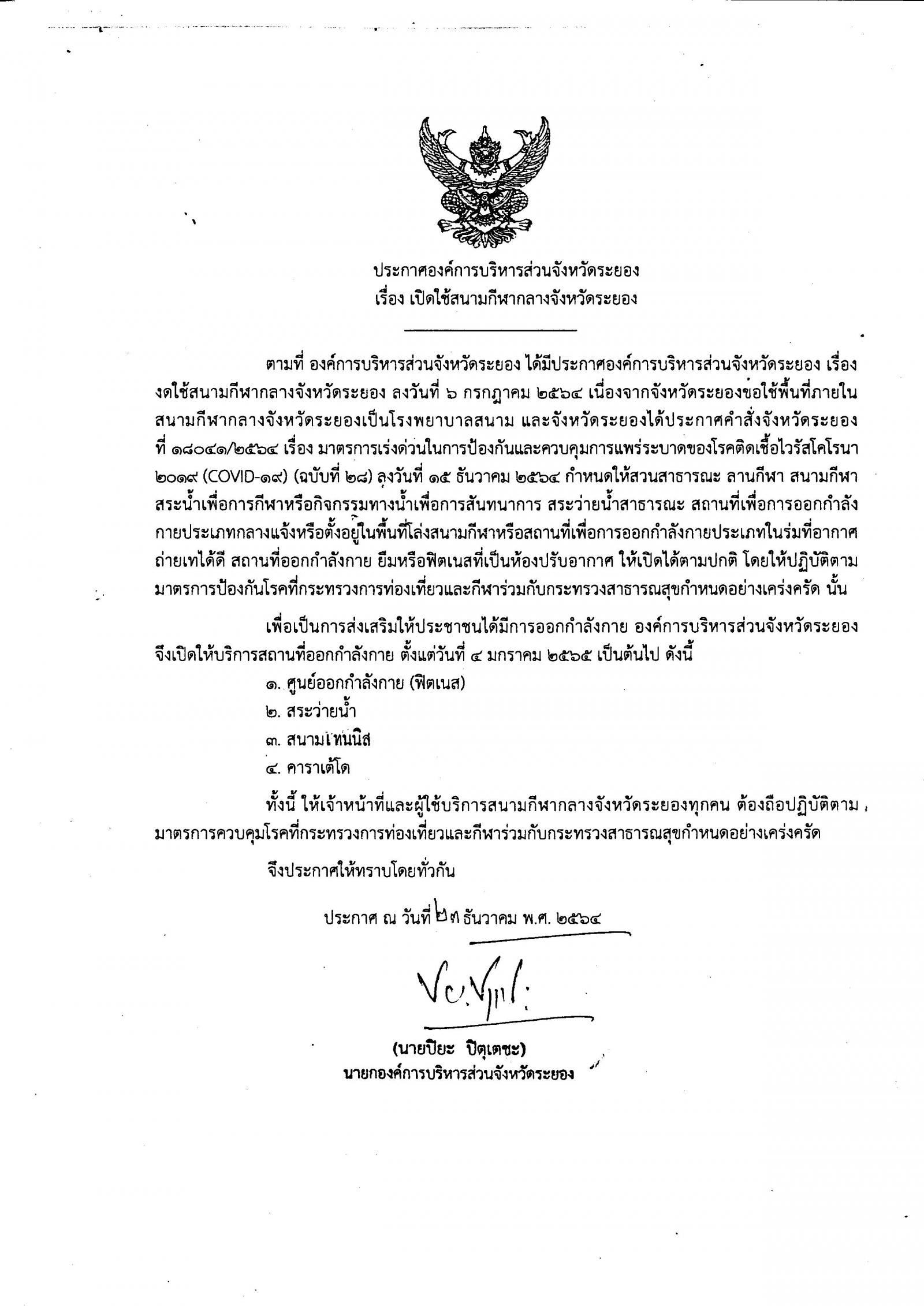 ประกาศ อบจ.ระยอง เรื่อง เปิดใช้สนามกีฬากลางจังหวัดระยอง
