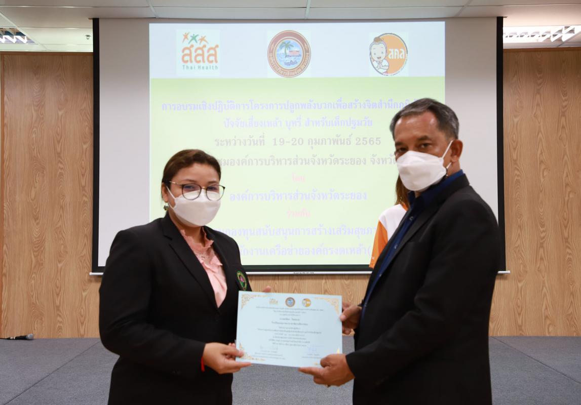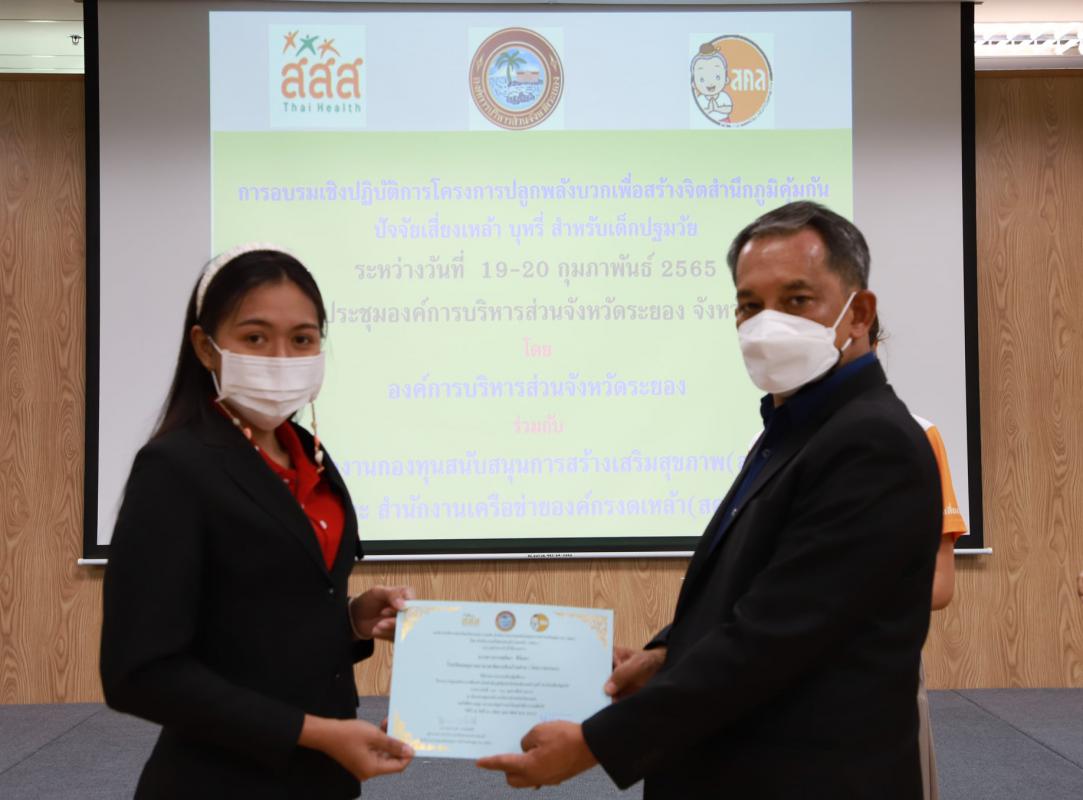 โครงการดังกล่าวจัดขึ้นตั้งแต่วันที่ 19-20 กุมภาพันธ์ 2565 โดยมีวัตถุประสงค์เพื่อส่งเสริม สนับสนุนพัฒนาครูปฐมวัยของสถานศึกษาในสังกัดฯ ให้เป็นเครือข่ายโครงการปลูกพลังบวกเพื่อสร้างจิตสำนึกภูมิคุ้มกันปัจจัยเสี่ยง และให้ครูได้รับการพัฒนาจนเกิดความรู้ ความเข้าใจ และสามารถจัดการศึกษาให้เป็นผลสำเร็จ และตลอดระยะเวลาการจัดกิจกรรมโครงการนั้น ได้มีเจ้าหน้าที่จากสำนักงานเครือข่ายองค์กรงดเหล้า (สคล.) และสำนักงานกองทุนการสนับสนุนการสร้างเสริมสุขภาพ (สสส.) เป็นผู้ที่จะมาบรรยายและให้ความรู้เกี่ยวกับการบูรณาการแผนการสอน และพรบ.ควบคุมเครื่องดื่มแอลกอฮอล์ หลังจากนั้นในวันที่ 20 กุมภาพันธ์ 2565 มีนายประสานต์ พฤกษาชาติ รองนายกองค์การบริหารส่วนจังหวัดระยอง (2) เป็นผู้มอบวุฒิบัตรให้แก่ผู้เข้าร่วมโครงการทุกคน พร้อมทั้งให้คำแนะนำและมอบนโยบาย เพื่อให้ผู้เข้าร่วมโครงการไปพัฒนาและเพิ่มศักยภาพในการเรียนการสอนต่อไป