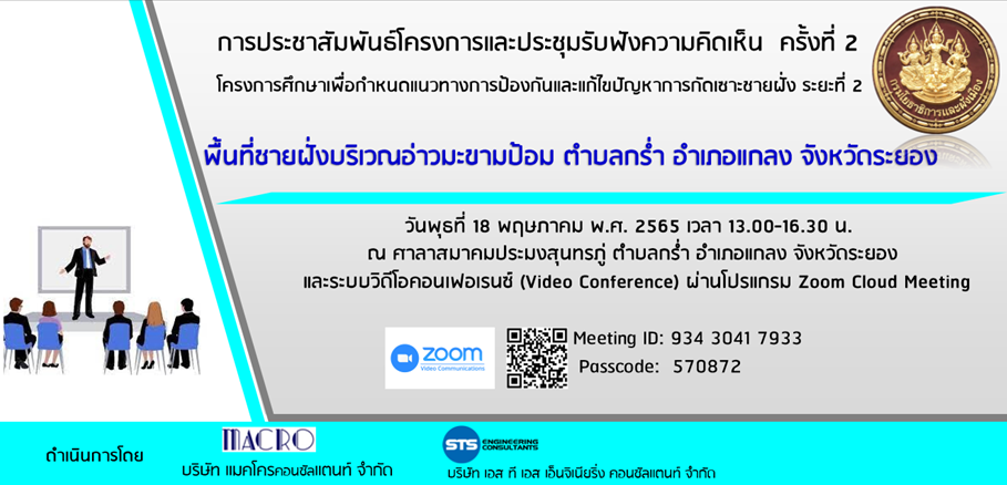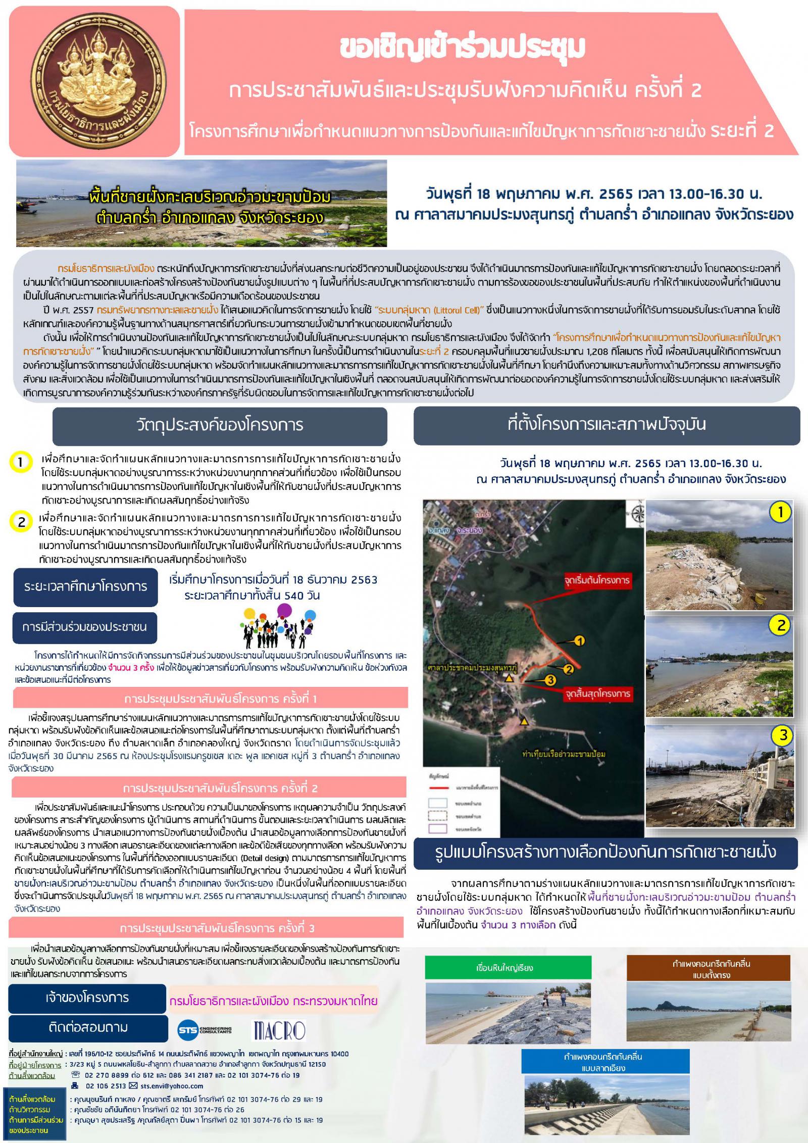 ประชาสัมพันธ์โครงการและประชุมรับฟังความคิดเห็น ครั้งที่ ๒ โครงการศึกษาเพื่อกำหนดแนวทางป้องกันและแก้ไขปัญหาการกัดเซาะชายฝั่ง ระยะที่ ๒ พื้นที่ชายฝั่งบริเวณอ่าวมะขามป้อม ตำบลกร่ำ อำเภอแกลง จังหวัดระยอง