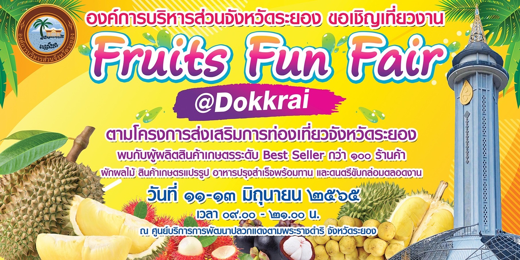 องค์การบริหารส่วนจังหวัดระยอง ขอเชิญเที่ยวงาน Fruits Fun Fair @Dokkrai ตามโครงการส่งเสริมการท่องเที่ยวจังหวัดระยอง วันที่ ๑๑-๑๓ มิถุนายน ๒๕๖๕ ๐๙.๐๐-๒๑.๐๐ น. ณ ศูนย์บริการการพัฒนาปลวกแดงตามพระราชดำริ จังหวัดระยอง