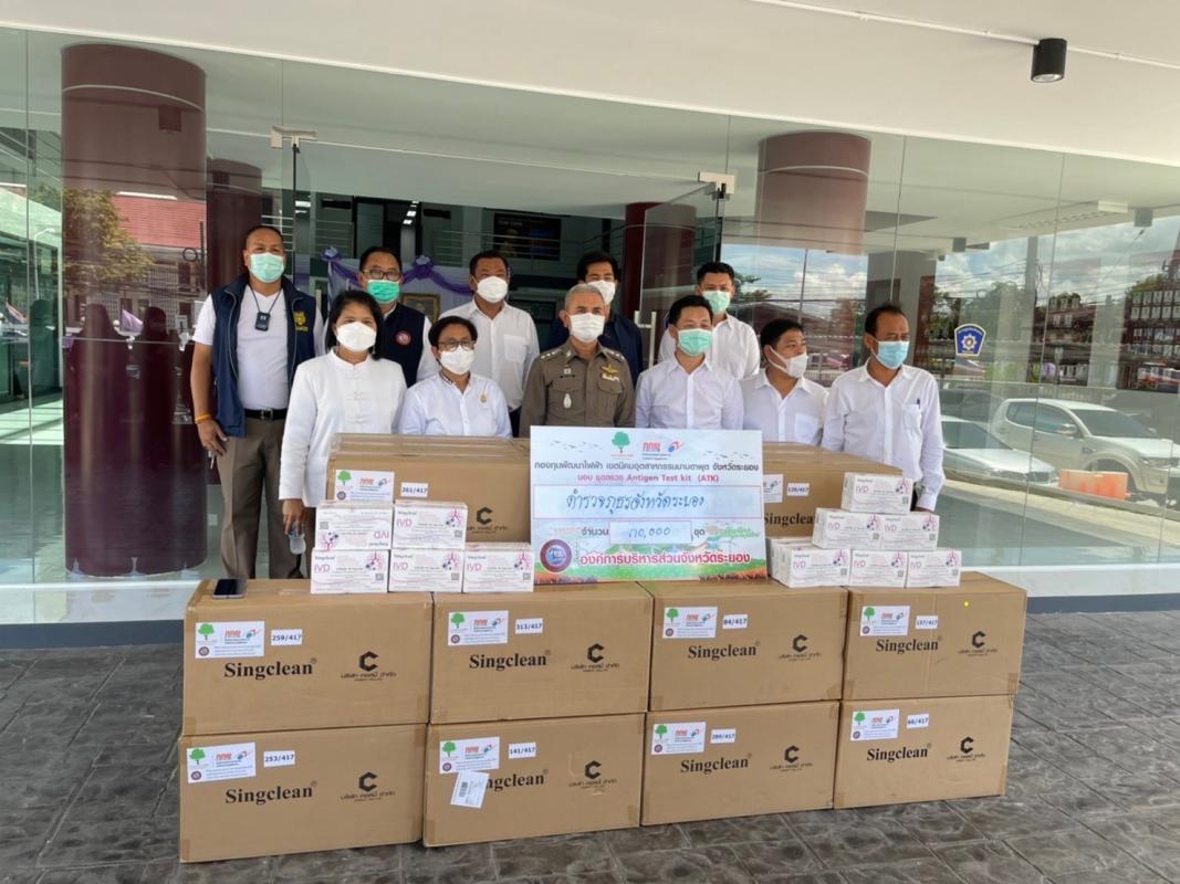 วันที่ 8 มิถุนายน 2565 อบจ.ระยอง ร่วมกับ กองทุนพัฒนาไฟฟ้า เขตนิคมอุตสาหกรรมมาบตาพุด จังหวัดระยอง มอบชุดตรวจเชื้อโควิด (ATK) จำนวน 30,000 ชุด ให้กับ สถานีตำรวจภูธรจังหวัดระยอง โดยมีนายกิตติ เกียรติ์มนตรี รองนายกองค์การบริหารส่วนจังหวัดระยอง พร้อมด้วย นางสุพรรณี สุขสันต์รุ่งเรือง ปลัด อบจ.ระยอง , สจ.จิตรดา ศรีรัตนโช , สจ.ไพฑูรย์ รัตนพรวารีสกุล, สจ.ศุภชัย จิตรดล, สจ.สุทิน แก้วประถม, สจ.รุ่งโรจน์ ศิลมัฐ, สจ.วิทยา ซุ่นหลี พร้อมเจ้าหน้าที่ร่วมเป็นตัวแทนจาก อบจ.ระยอง มอบชุดตรวจดังกล่าวเพื่อใช้ให้เกิดประโยชน์ต่อไป