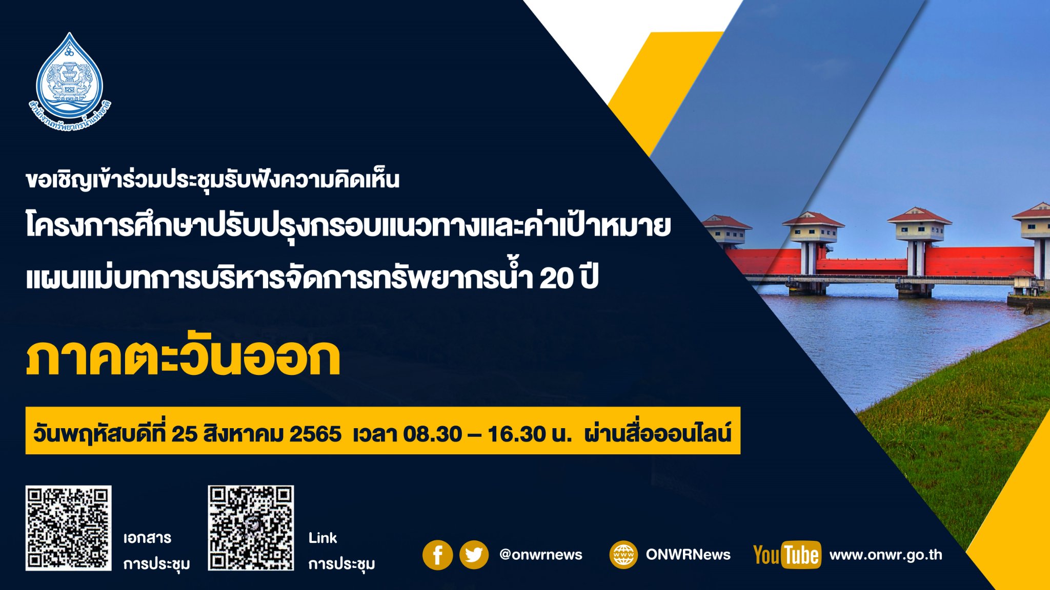 ประชาสัมพันธ์การประชุมรับฟังความคิดเห็นภาคตะวันออกโครงการศึกษาปรับปรุงกรอบแนวทางและค่าเป้าหมายแผนแม่บทการบริหารจัดการทรัพยากรน้ำ ๒๐ ปี