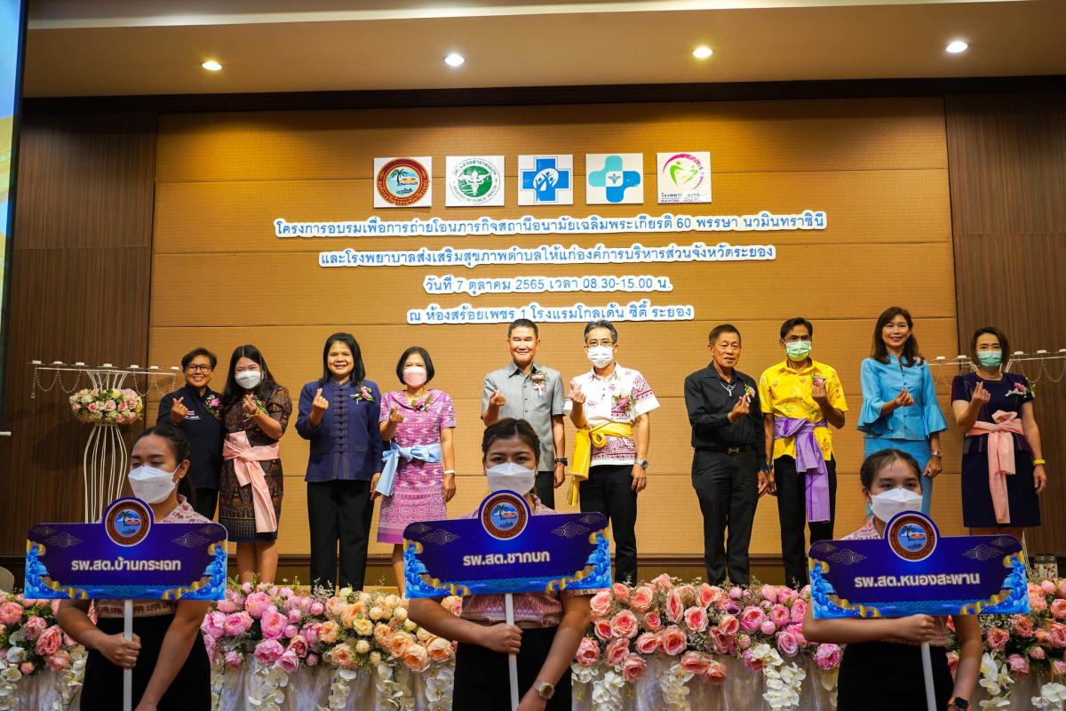 ซึ่งในพิธีลงนามบันทึกข้อตกลงความร่วมมือ (MOU) เพื่อสร้างความร่วมมือร่วมกันในการบริการด้านสาธารณสุขให้ประชาชนมีคุณภาพชีวิตที่ดีขึ้นเป็นชุมชนที่เข็มแข็ง รวมถึงบุคลากรผู้ปฏิบัติราชการด้านสาธารณสุขมีความก้าวหน้าในหน้าที่ราชการ มีขวัญกำลังใจในการปฏิบัติราชการและประโยชน์สูงสุดของประชาชนโดยมี พิธี “ผูกผ้ารับขวัญวันถ่ายโอน รพ.สต.” ทั้งนี้การลงนามบันทึกข้อตกลงความร่วมมือ (MOU) การถ่ายโอนสถานีอนามัยเฉลิมพระเกียรติ 60 พรรษานวมินทราชินี (สอน.) และโรงพยาบาลส่งเสริมสุขภาพตำบล (รพ.สต.) ทั้ง 40 แห่ง ให้แก่ อบจ.ระยอง เป็นไปตามการกระจายอำนาจให้แก่องค์กรปกครองส่วนท้องถิ่น ซึ่งจะเป็นการเสริมระบบสุขภาพของประชาชนชาวระยองให้เข้มแข็งในทุกมิติ และยังคงมาตรฐานตามหลักสาธารณสุขของกระทรวงสาธารณสุข โดย อบจ.ระยอง มีความพร้อมในการสนับสนุนในทุก ๆ ด้าน เพื่อให้พี่น้องชาวระยองได้รับการบริการสาธารณะ ด้านสาธารณสุขที่มีคุณภาพดียิ่งขึ้นในทุกพื้นที่
