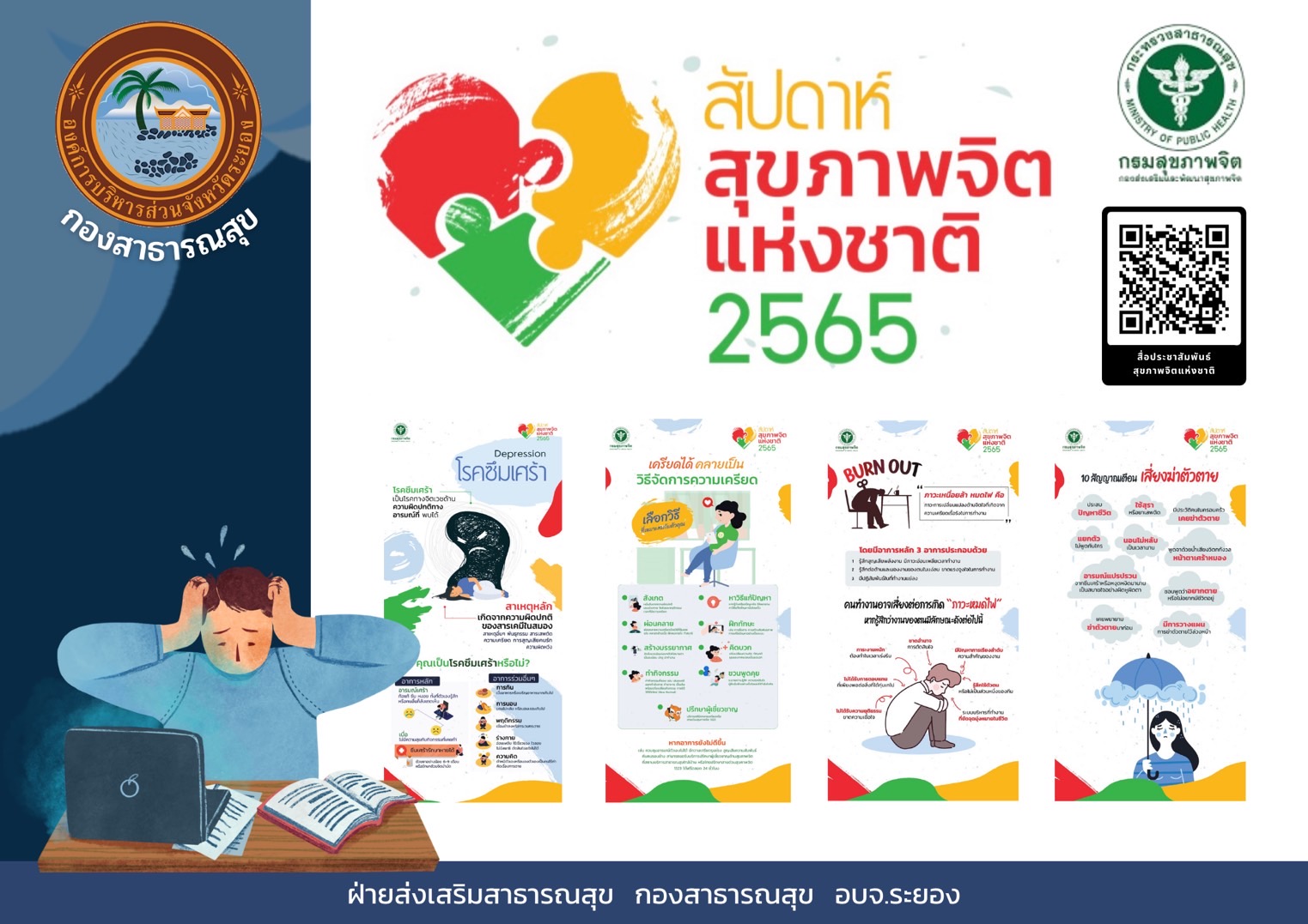 ด้วย จังหวัดระยอง มีหนังสือที่ รย ๐๐๓๓/ว ๕๘๒๓ ลงวันที่ ๑๐ พฤศจิกายน ๒๕๖๕ โดยเดือนพฤศจิกายนของทุกปี เป็นเดือนแห่งการรณรงค์สัปดาห์สุขภาพจิตแห่งชาติ เพื่อประชาสัมพันธ์และสร้างความรอบรู้การดูแลสุขภาพจิตสู่ประชาชน ตลอดจนกระตุ้นให้สังคมตระหนักถึงความสำคัญของการค้นหากลุ่มเสี่ยงต่อปัญหาสุขภาพจิต.ส่งเสริมให้ผู้มีความเสี่ยงสามารถประเมินตนเอง และเข้าถึงบริการได้อย่างรวดเร็วด้วยการวัดใจของตนเองอย่างสม่ำเสมอ รวมทั้งเสริมสร้างความร่วมมือของเครือข่ายในการดูแลสุขภาพจิตภายใต้หัวข้อ “วัดใจ เติมพลัง สังคมมีสุข” ดังนั้น สำนักงานสาธารณสุขจังหวัดระยอง ขอความร่วมมือรณรงค์สัปดาห์สุขภาพจิตแห่งชาติ ประจำปี ๒๕๖๕ ในสังกัดองค์การบริหารส่วนจังหวัดระยอง เพื่อร่วมรณรงค์เผยแพร่ประชาสัมพันธ์ความรู้สุขภาพจิตสู่ประชาชนตลอดเดือนพฤศจิกายน พ.ศ. ๒๕๖๕ โดยสามารถดาวน์โหลดสื่อความรู้งานสัปดาห์สุขภาพจิต เพื่อนำไปใช้เผยแพร่ได้ตาม OR Code หรือ URL รายละเอียดตามสิ่งที่แนบมาด้วย เพื่อให้บุคลากรในสังกัดองค์การบริหารส่วนจังหวัดระยอง และประชาชนในจังหวัดระยองทราบถึงข้อมูลสื่อความรู้งานสัปดาห์สุขภาพจิต รวมทั้งเพื่อเป็นการรณรงค์สัปดาห์สุขภาพจิตแห่งชาติประจำปี ๒๕๖๕๖