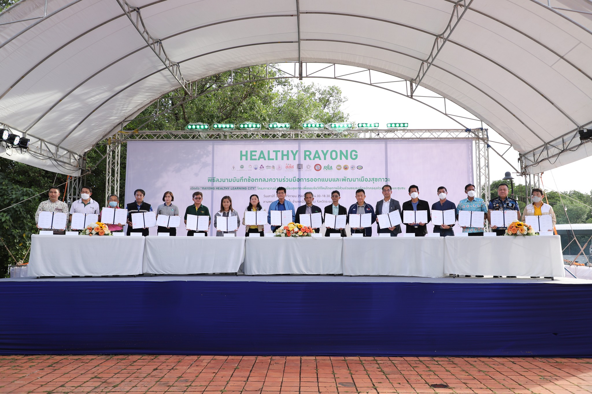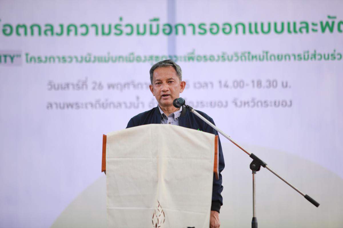 วันที่ 26 พฤศจิกายน 2565 เวลา 15.30 น. ณ พระเจดีย์กลางน้ำ อ.เมืองระยอง จ.ระยอง ดร.สาธิต ปิตุเตชะ รัฐมนตรีช่วยว่าการกระทรวงสาธารณสุข เป็นประธานในพิธีลงนามบันทึกความร่วมมือ "โครงการจัดทำผังแม่บทเมืองสุขภาวะเพื่อรองรับวิถีใหม่โดยการมีส่วนร่วมขององค์กรปกครองส่วนท้องถิ่นและชุมชน" จังหวัดระยอง พร้อมด้วย นายประสานต์ พฤกษาชาติ รองนายกองค์การบริหารส่วนจังหวัดระยอง (2), พ.จ.อ.ธีรพันธ์ ศิริปักมานนท์ ผู้แทนจังหวัดระยอง, นางประภาศรี บุญวิเศษ สำนักงานกองทุนสนับสนุนการสร้างเสริมสุขภาพ (สสส.), นายสมศักดิ์ พะเนียงทอง ผู้อำนวยการสถาบันการเรียนรู้ของคนทุกช่วงวัยจังหวัดระยอง (RILA), นพ.ปรีดา แต้อารักษ์ รองเลขาริการคณะกรรมการสุขภาพแห่งชาติ, นายนายภูบิต ไซยฉ่ำ รองนายกเทศมนตรีนครระยอง, นายถวิล โพธิบัวทอง นายกเทศมนตรีเมืองมาบตาพุด, นายบุญธรรม ไยกล้า นายกเทศมนตรีตำบลเนินพระ, นายประเสริฐ วงษ์ศรี นายกเทศมนตรีตำบลทับมา, นพ.สุนทร เหรียญภูมิการกิจ นายแพทย์สาธารณสุขจังหวัดระยอง, นพ.ภูษิต ทรัพย์สมพล ผู้อำนวยการโรงพยาบาลระยอง, นพ.สุกิจ บรรจงกิจ ผู้อำนวยการโรงพยาชาลเฉลิมพระเกียรติสมเด็จพระเทพรัตนราชสุดาฯ สยามบรมราชกุมารี ระยอง, นายสุทธิธรรม เลขวิวัฒน์ ประธานสมัชชาสุขภาพจังหวัดระยอง, นายเจริญชัย ประเทืองสุขศรี สมาคมเพื่อนชุมชน, นายวิเชียร ทองด้วง อุตสาหกรรมจังหวัดระยอง, นายภุชงค์ สฤษฎีชัยกุล ผู้อำนวยการสำนักงานทรัพยากรทางทะเลและชายฝั่งที่ 1, นายประยงค์ โพธิ์ศรีประเสริฐ สถาบันอาศรมศิลป์ และผู้ที่เกี่ยวข้องเข้าร่วมพิธีลงนามบันทึกความร่วมมือฯ โดยพร้อมเพรียงกัน