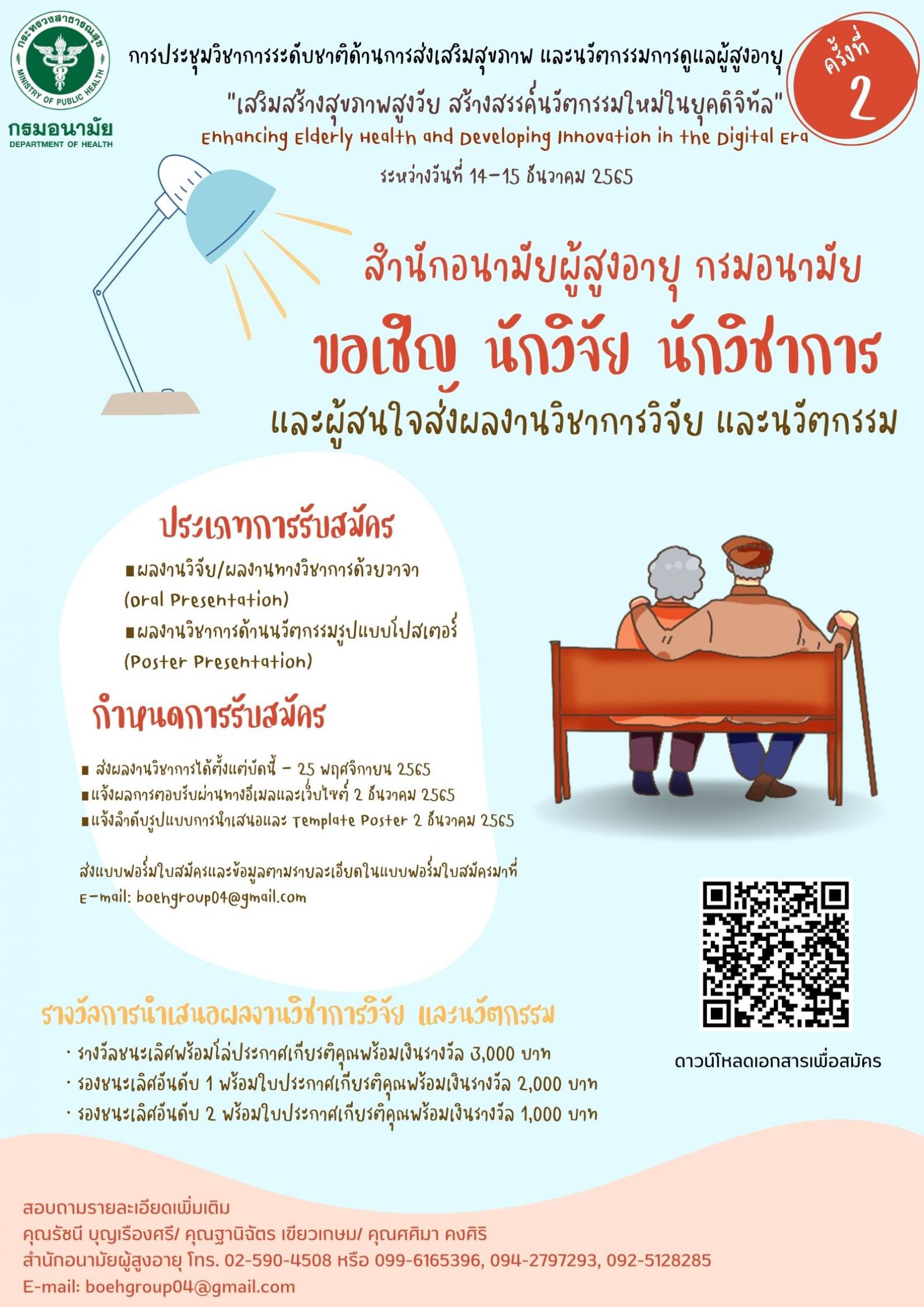 ประชาสัมพันธ์ร่วมส่งผลงานวิจัยและนวัตกรรมเข้าประกวดงานประชุมวิชาการระดับชาติด้านการส่งเสริมสุขภาพและนวัตกรรมการดูแลผู้สูงอายุ ครั้งที่.2