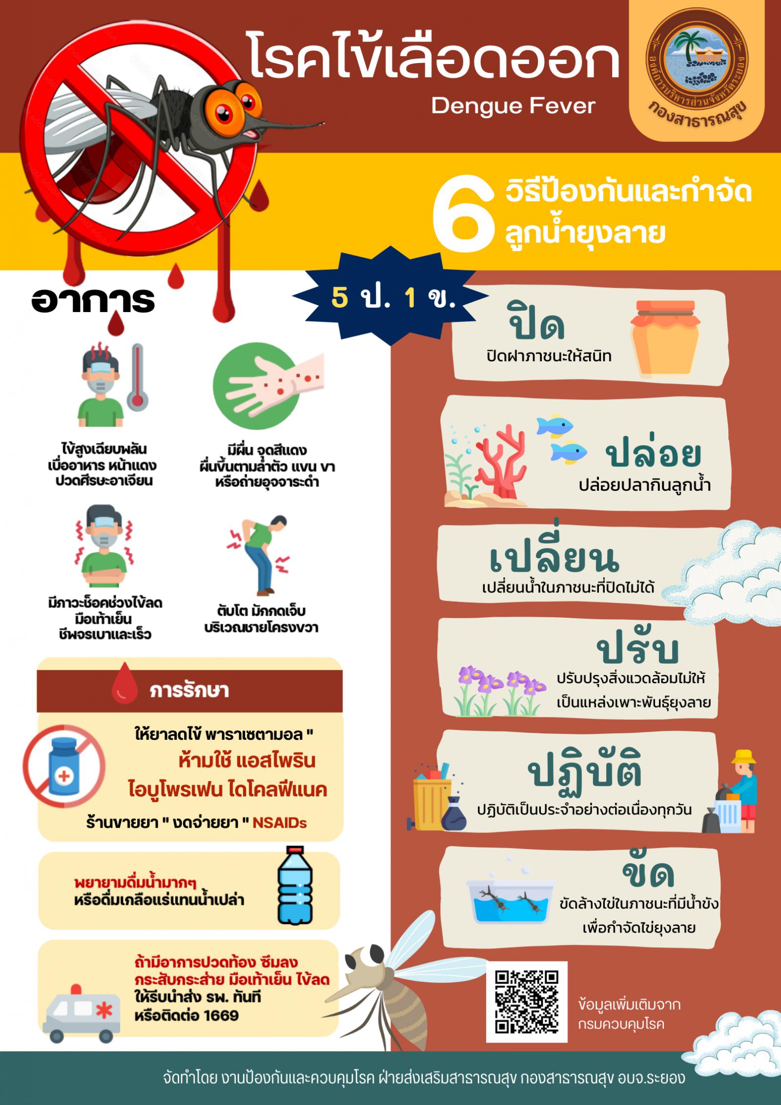 ในการนี้ เพื่อประชาสัมพันธ์เผยแพร่สื่อแนวทางการป้องกันโรคไข้เลือดออก ให้ประชาชนในจังหวัดระยอง ทราบถึงความเสี่ยงและความรุนแรงของโรค เรื่อง วิธีการกำจัดลูกน้ำยุงลายและการป้องกันยุงกัด รวมถึงอาการสำคัญที่ต้องไปพบแพทย์ และไม่ควรซื้อยาในกลุ่ม NSAIDs รับประทานเอง ตลอดจนสร้างความตระหนักในการเฝ้าระวังโรค พร้อมทั้งแนวทางการป้องกันและเฝ้าระวังโรคไข้เลือดออกในช่วงฤดูกาลระบาดได้อย่างถูกต้อง รายละเอียดตามเอกสารที่แนบมาพร้อมนี้