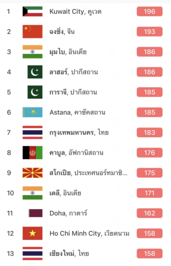 จากข้อมูลของ IQAir หรือ หน่วยงานด้านเทคโนโลยีคุณภาพอากาศของสวิตเซอร์แลนด์ ผู้เชี่ยวชาญในการป้องกันมลพิษในอากาศ และผู้กำหนดดัชนีคุณภาพอากาศ (AQI) หรือการวัดความเข้มข้นของมลพิษทางอากาศในมลพิษทางอากาศโดยรอบและความเสี่ยงต่อสุขภาพที่เกี่ยวข้องได้อัพเดทสภาพอากาศและสถานการณ์ PM 2.5 พบว่ากรุงเทพฯ เป็นเมืองที่มีมลพิษทางอากาศสูงเป็นอันดับ 7 ของโลก ดัชนีคุณภาพอากาศอยู่ที่ 183 AQI ในขณะที่ จ.เชียงใหม่ รั้งอันดับ 13 ของโลก ดัชนีคุณภาพอากาศของสถานีตรวจวัดของกรุงเทพมหานคร พบว่าส่วนใหญ่อยู่ในระดับคุณภาพอากาศเริ่มมีผลกระทบต่อสุขภาพ และคาดว่าอัตราการระบายอากาศในช่วงนี้จะไม่ดีขึ้น เนื่องจากเพดานอากาศต่ำ เกิดสภาวะอากาศปิดอย่างต่อเนื่อง ส่งผลให้เกิดการสะสมของฝุ่นละออง PM 2.5 มีแนวโน้มเพิ่มขึ้น