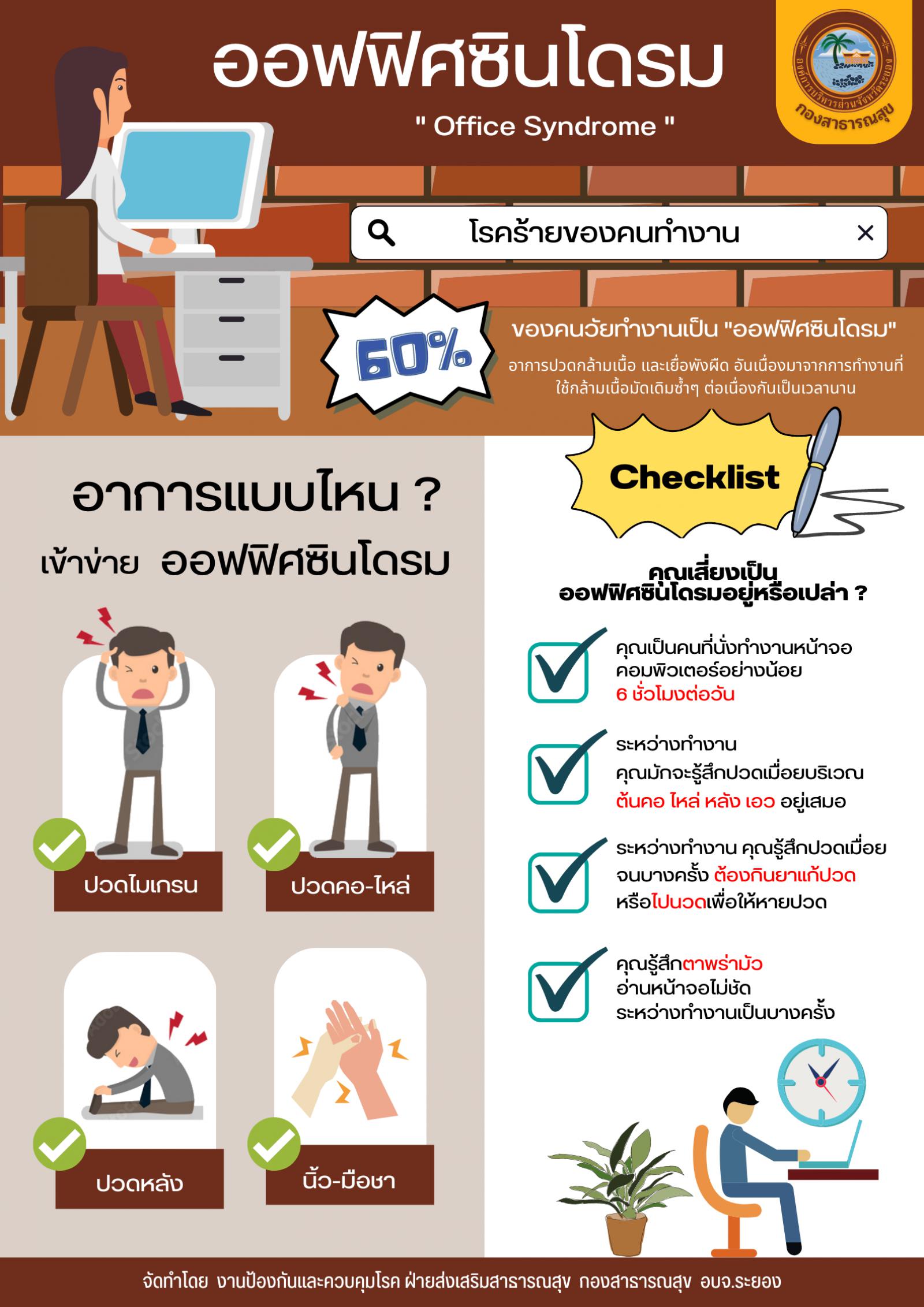 จากข้อมูลสถิติของกรมอนามัย กระทรวงสาธารณสุข พบว่าคนวัยทำงานร้อยละ ๖๐ มีภาวะของโรคออฟฟิศซินโดรม ซึ่งผู้ที่มีอาการภาวะกลุ่มออฟฟิศซินโดรมส่วนใหญ่จะเกิดความรู้สึกไม่สบายตัว ยากต่อการเคลื่อนไหว และจะส่งผลต่อการใช้ชีวิตประจำวันในระยะยาว กองสาธารณสุข องค์การบริหารส่วนจังหวัดระยอง จึงจัดทำสื่อประชาสัมพันธ์โรคออฟฟิศซินโดรม (office syndrome) ภายในโครงการทำงานอย่างไร ไม่เสี่ยงภัย “ออฟฟิศซินโดรม” ปีงบประมาณ พ.ศ. ๒๕๖๖ โดยการดำเนินโครงการดังกล่าวฯ ประกอบด้วยกิจกรรม การให้ความรู้เกี่ยวกับโรคไม่ติดต่อผ่านสื่อประชาสัมพันธ์ตลอดปีงบประมาณ พ.ศ. ๒๕๖๖ เพื่อให้บุคลากรในสังกัดองค์การบริหารส่วนจังหวัดระยอง และประชาชนในจังหวัดระยอง มีความรู้ ความเข้าใจ และมีทักษะในการปรับเปลี่ยนพฤติกรรมที่เหมาะสม ในการนี้ เพื่อประชาสัมพันธ์เผยแพร่สื่อโรคออฟฟิศซินโดรม จึงขอประชาสัมพันธ์เผยแพร่สื่อดังกล่าวฯ พร้อมรายละเอียดปรากฏตามเอกสารที่แนบมาพร้อมนี้