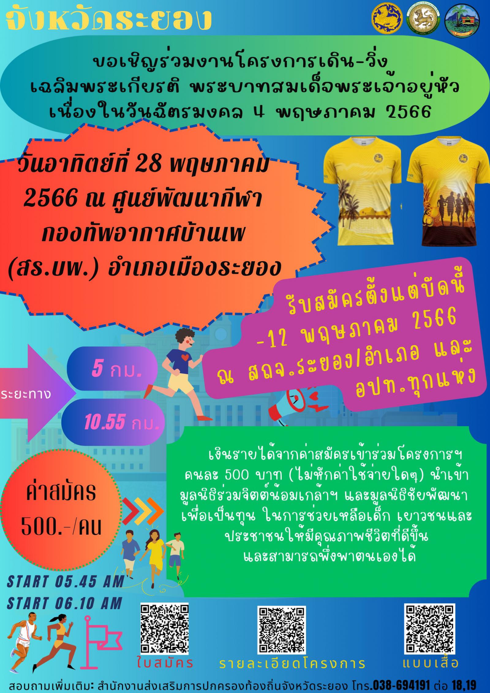 ขอเชิญร่วมงานโครงการเดิน-วิ่ง เฉลิมพระเกียรติ พระบาทสมเด็จพระเจ้าอยู่หัว เนื่องในวันฉัตรมงคล ๔ พฤษภาคม ๒๕๖๖ ในวันอาทิตย์ ที่ ๒๘ พฤษภาคม ๒๕๖๖ ณ ศูนย์พัฒนากีฬากองทัพอากาศบ้านเพ (สร.บพ.) อำเภอเมืองระยอง