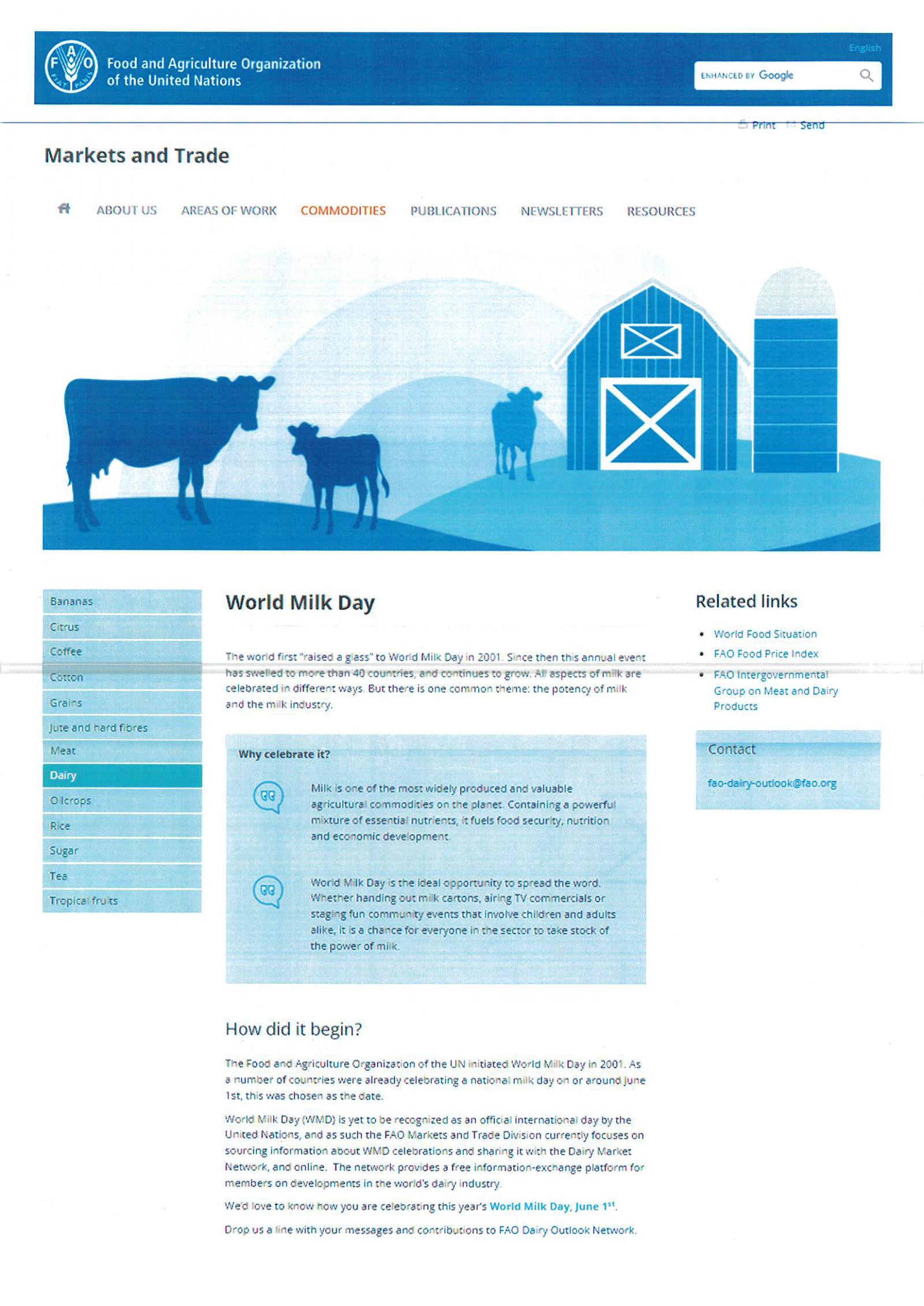 องค์การอาหารและการเกษตรแห่งสหประชาชาติ (The Food and Agriculture Organization หรือ FAO ) กำหนดให้วันที่ ๑ มิถุนายน ของทุกปีเป็นวันดื่มนมโลก (World Milk Day) เนื่องจากนมและผลิตภัณฑ์จากนมมีความสำคัญต่อโภชนาการของคนตลอดทุกช่วงชีวิต โดยเฉพาะวัยเด็ก
