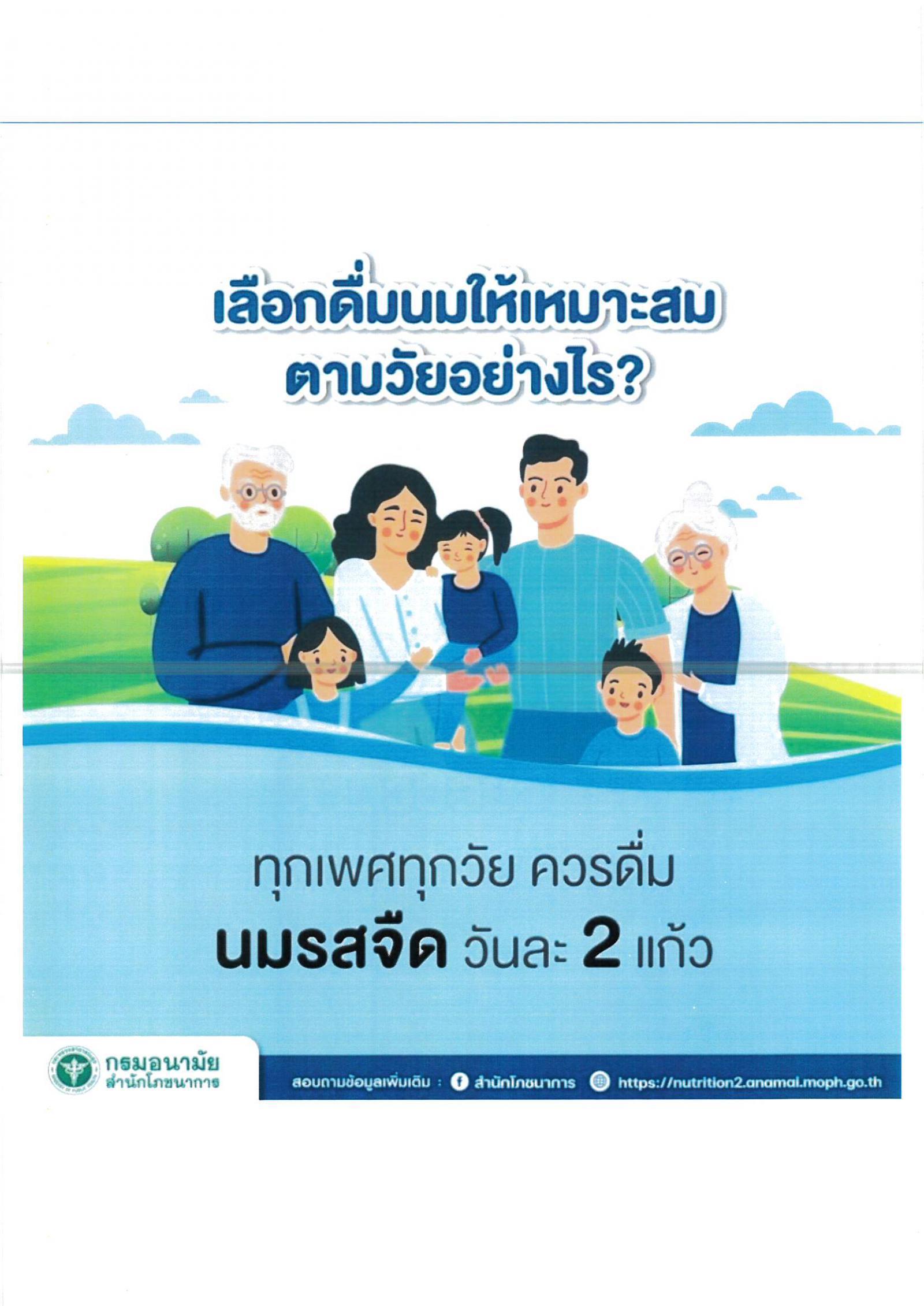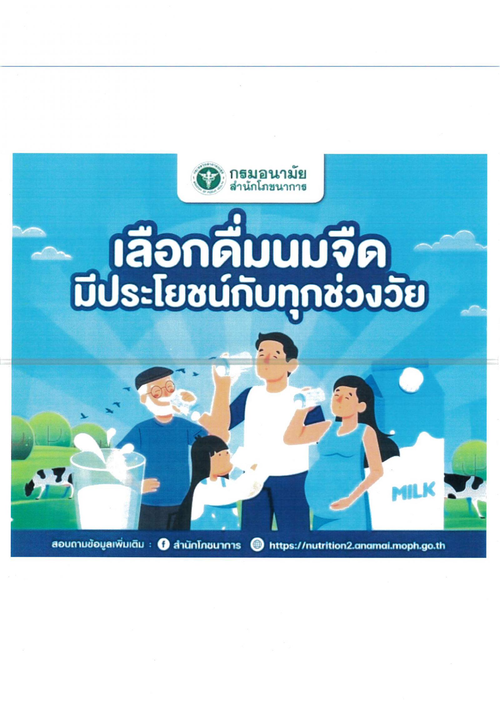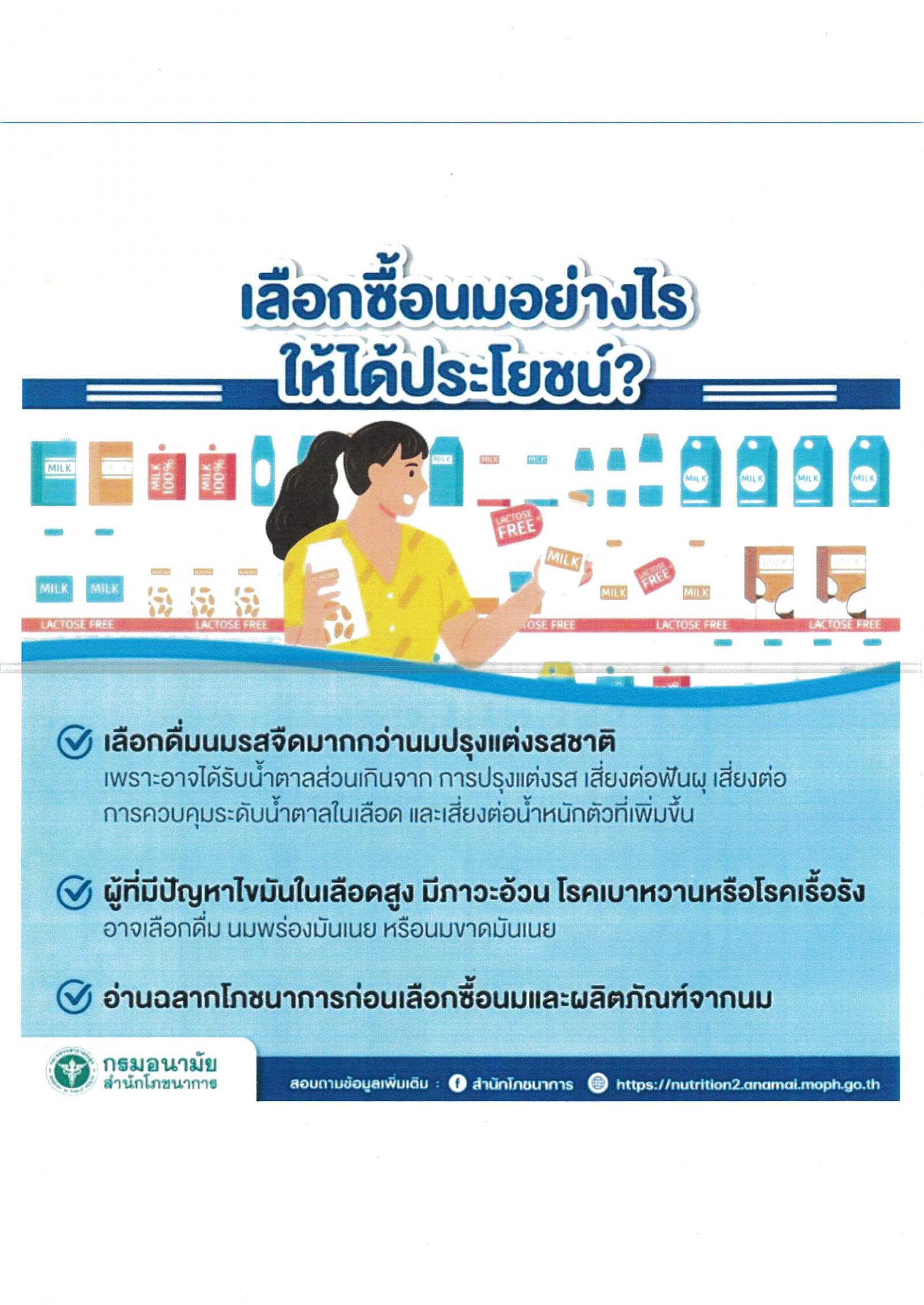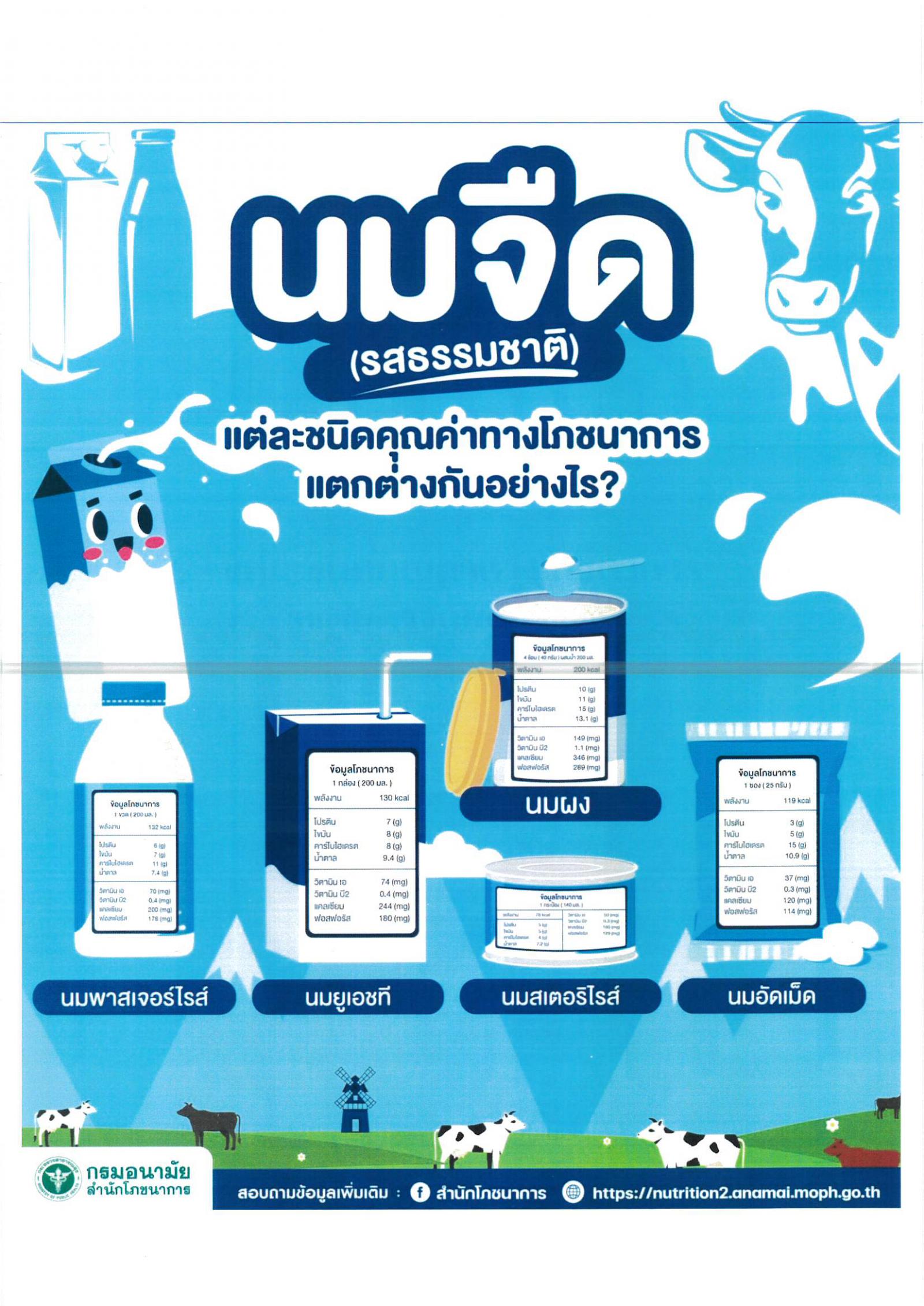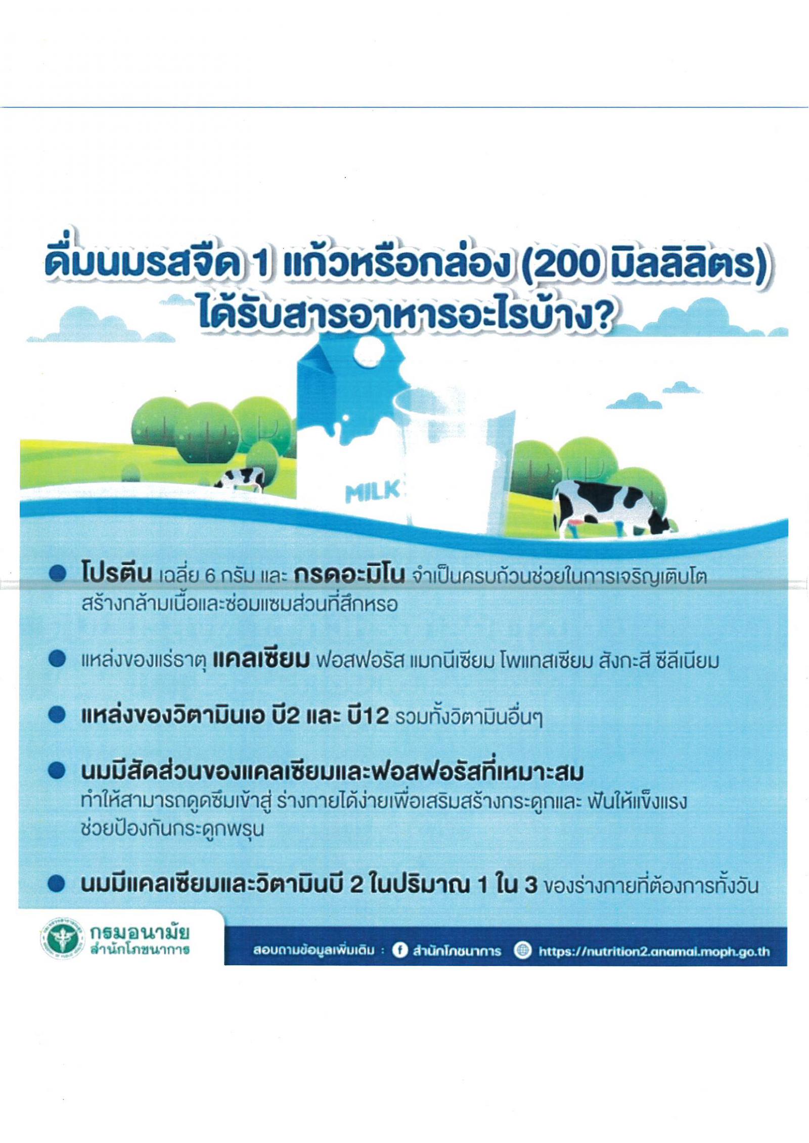 มีความสำคัญเป็นอย่างมากในกระบวนการเจริญเติบโต แนะนำให้ดื่มนมจืด มากกว่านมหวาน หรือนมเปรี้ยว เพราะนมจืดเป็นแหล่งอาหารที่มีแร่ธาตุแคลเซียมสูงมากกว่านมชนิดอื่น นอกจากนี้ยังอุดมไปด้วยโปรตีน เกลือแร่ต่าง ๆ เช่น ฟอสฟอรัส แมกนีเซียม โพแทสเซียม คาร์โบไฮเดรต ไขมัน และวิตามิน ช่วยเสริมสร้างกระดูกและฟันให้แข็งแรง ช่วยซ่อมแซมส่วนที่สึกหรอของร่างกาย มีส่วนช่วยในการพัฒนาระบบประสาท และสมอง การดื่มนมจืดยังช่วยลดพฤติกรรมติดหวาน ส่งผลให้ไม่เป็นโรคอ้วน ดังนั้น ใน ๑ วัน เราควรดื่มนมจืดอย่างน้อยวันละ ๒ แก้ว หรือประมาณ ๔๐๐ มิลลิลิตร เพื่อการมีสุขภาพที่ดี และแข็งแรง รายละเอียดปรากฏตามเอกสารที่แนบมาพร้อมนี้