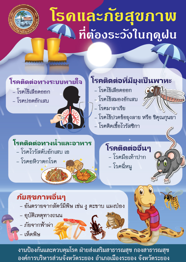 ด้วยกรมอุตุนิยมวิทยา ออกประกาศเรื่อง การเริ่มต้นฤดูฝนของประเทศไทย โดยระบุว่า ประเทศไทยจะสิ้นสุดฤดูร้อนและเริ่มต้นเข้าสู่ฤดูฝน ในวันที่ ๒๒ พฤษภาคม ๒๕๖๖ ส่งผลให้สภาพอากาศ มีการเปลี่ยนแปลง มีฝนตกชุกหนาแน่นและต่อเนื่อง ครอบคลุมพื้นที่ส่วนใหญ่ของประเทศ และกรมควบคุมโรค ได้ออกประกาศ เรื่อง การป้องกันโรคและภัยสุขภาพที่เกิดในช่วงฤดูฝนของประเทศไทย พ.ศ. ๒๕๖๖ ซึ่งการเปลี่ยนแปลงของสภาพอาการเป็นสาเหตุทำให้เกิดโรคติดต่อและภัยสุขภาพ เช่น โรคไข้หวัดใหญ่ (Influenza) โรคปอดอักเสบ (Pneumonia) โรคมือ เท้า ปาก (Hand foot Mouth Disease) โรคเลปโตสไปโรซิส หรือโรคฉี่หนู (Leptospirosis) โรคไข้เลือดออก และโรคไข้ปวดข้อยุงลาย หรือโรคชิคุนกุนยา เป็นต้น งานป้องกันและควบคุมโรค ฝ่ายส่งเสริมสาธารณสุข กองสาธารณสุข องค์การบริหารส่วนจังหวัดระยอง จึงมีความห่วงใยในสุขภาพของประชาชน หากดูแลสุขภาพอนามัยไม่ถูกต้อง อาจทำให้เกิดการเจ็บป่วยด้วยโรคติดต่อดังกล่าวได้ จึงได้จัดทำสื่อประชาสัมพันธ์โรคติดต่อที่ควรเฝ้าระวังในช่วงฤดูฝน