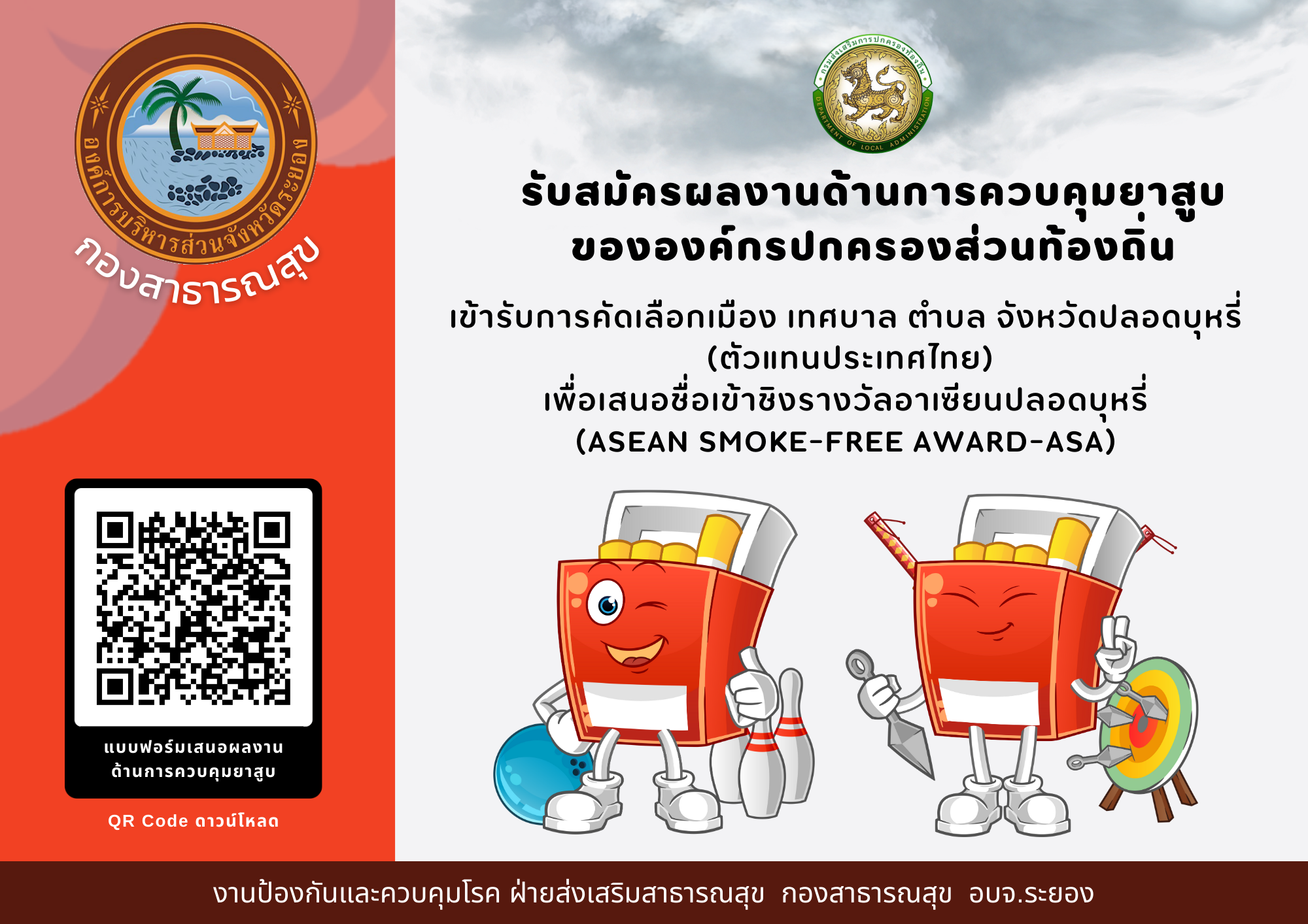 รับสมัครผลงานด้านการควบคุมยาสูบขององค์กรปกครองส่วนท้องถิ่น เข้ารับการคัดเลือกเมือง เทศบาล ตำบล จังหวัดปลอดบุหรี่ (ตัวแทนประเทศไทย) เพื่อเสนอชื่อเข้าชิงรางวัลอาเซียนปลอดบุหรี่ (ASEAN Smoke-free Award – ASA)