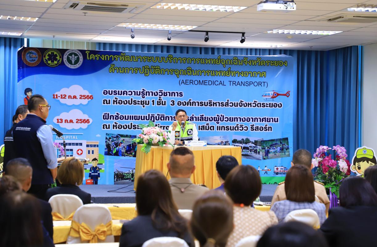 วันที่ 11 กรกฎาคม 2566 เวลา 09.00 น. นายปิยะ ปิตุเตชะ นายกองค์การบริหารส่วนจังหวัดระยอง เป็นประธานเปิด โครงการพัฒนาระบบบริการแพทย์ฉุกเฉินจังหวัดระยอง ด้านการปฏิบัติการฉุกเฉินการแพทย์ทางอากาศ (Aeromedical Transport) โดยมี นายชัยวัฒน์ จัตตุพร เลขานุการนายกองค์การบริหารส่วนจังหวัดระยอง เป็นผู้กล่าวรายงาน พร้อมด้วย คณะผู้บริหาร หัวหน้าส่วนราชการ ผู้อำนวยการกอง สมาชิกสภาองค์การบริหารส่วนจังหวัดระยอง เจ้าหน้าที่ภาครัฐ ภาคเอกชน และผู้ที่เกี่ยวข้องเข้าร่วมโครงการอย่างพร้อมเพรียง ณ ห้องประชุม 1 ชั้น 3 องค์การบริหารส่วนจังหวัดระยอง ซึ่งระหว่างการจัดโครงการ ได้มีการบรรยายในหัวข้อเรื่อง ระบบการแพทย์ฉุกเฉินของประเทศไทย โดยได้รับเกียรติจาก นาวาเอก (พิเศษ) พิสิทธิ์ เจริญยิ่ง รองเลขาธิการสถาบันการแพทย์ฉุกเฉินแห่งชาติ, เรื่องแนวทางการประสานและการจัดการลำเลียงทางน้ำ ได้รับเกียรติจาก น.อ. ณัฐศักดิ์ วรเจริญศรี จากโรงพยาบาลอาภากรเกียรติวงศ์ ฐานทัพเรือสัตหีบ และในช่วงบ่ายรับฟังการบรรยายในหัวข้อเรื่อง lncident Action Plan in Area ได้รับเกียรติจาก นายณรงค์รัฐ บุญต่อ และนายสัมฤทธิ์ วิชัยกำจร กลุมช่วยเหลือกรณีเกิดเหตุฉุกเฉิน (Emergency Mutual Aid Group : EMAG)