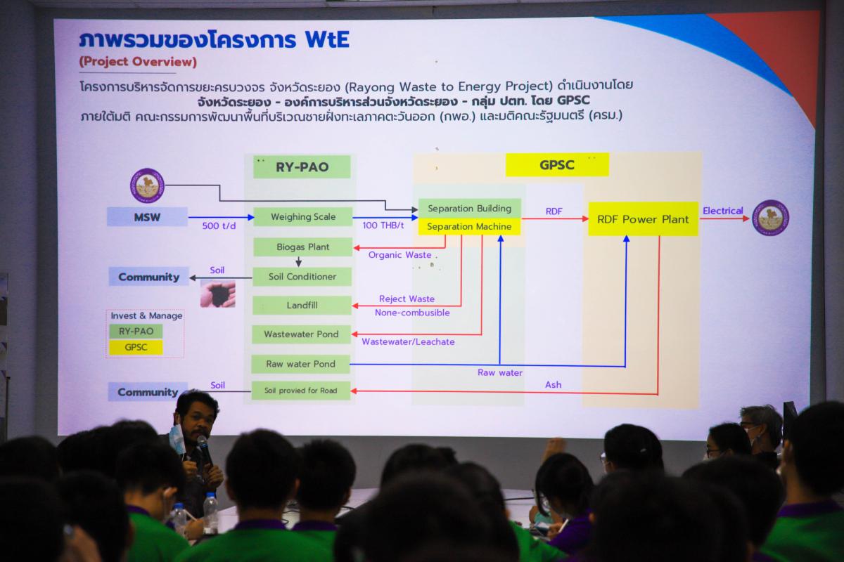 วันที่ 14 กรกฎาคม 2566 เวลา 09.00 น. โรงเรียนกำเนิดวิทย์ จ.ระยอง นำคณะนักเรียนและครู จำนวน 132 คน เข้าเยี่ยมชมและศึกษาดูงานระบบบริหารจัดการขยะแบบครบวงจรและการผลิตไฟฟ้าจากเชื้อเพลิงขยะ ณ ศูนย์กำจัดขยะมูลฝอยรวมแบบครบวงจร โดยมีเจ้าหน้าที่จากบริษัท GPSC และบริษัท RID ร่วมให้การต้อนรับพร้อมทั้งบรรยายให้ความรู้แก่ผู้เข้าศึกษาดูงานดังกล่าว