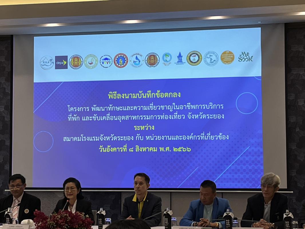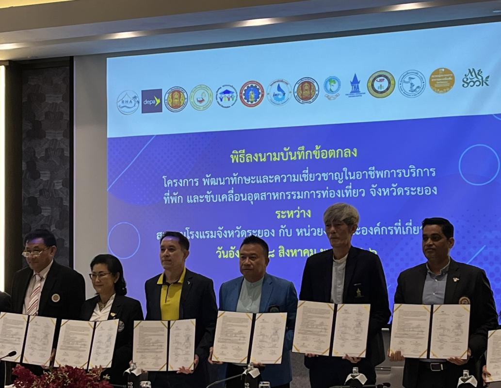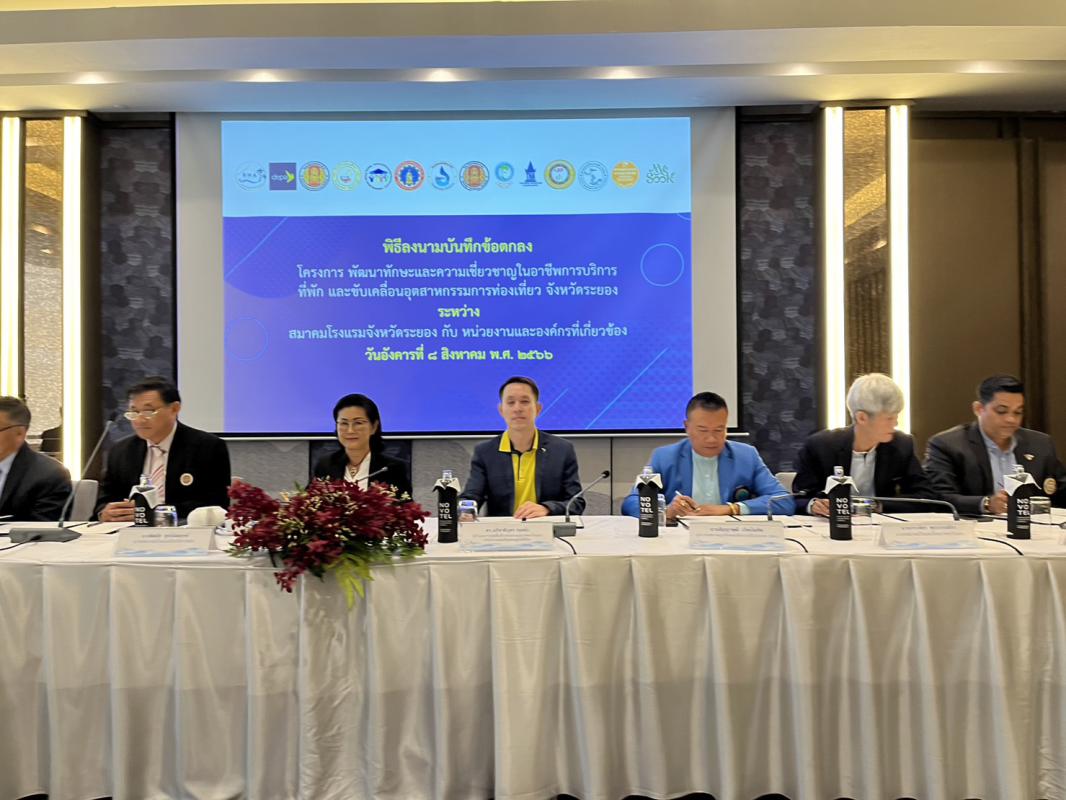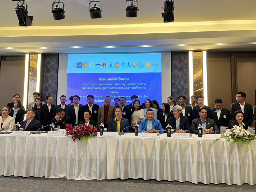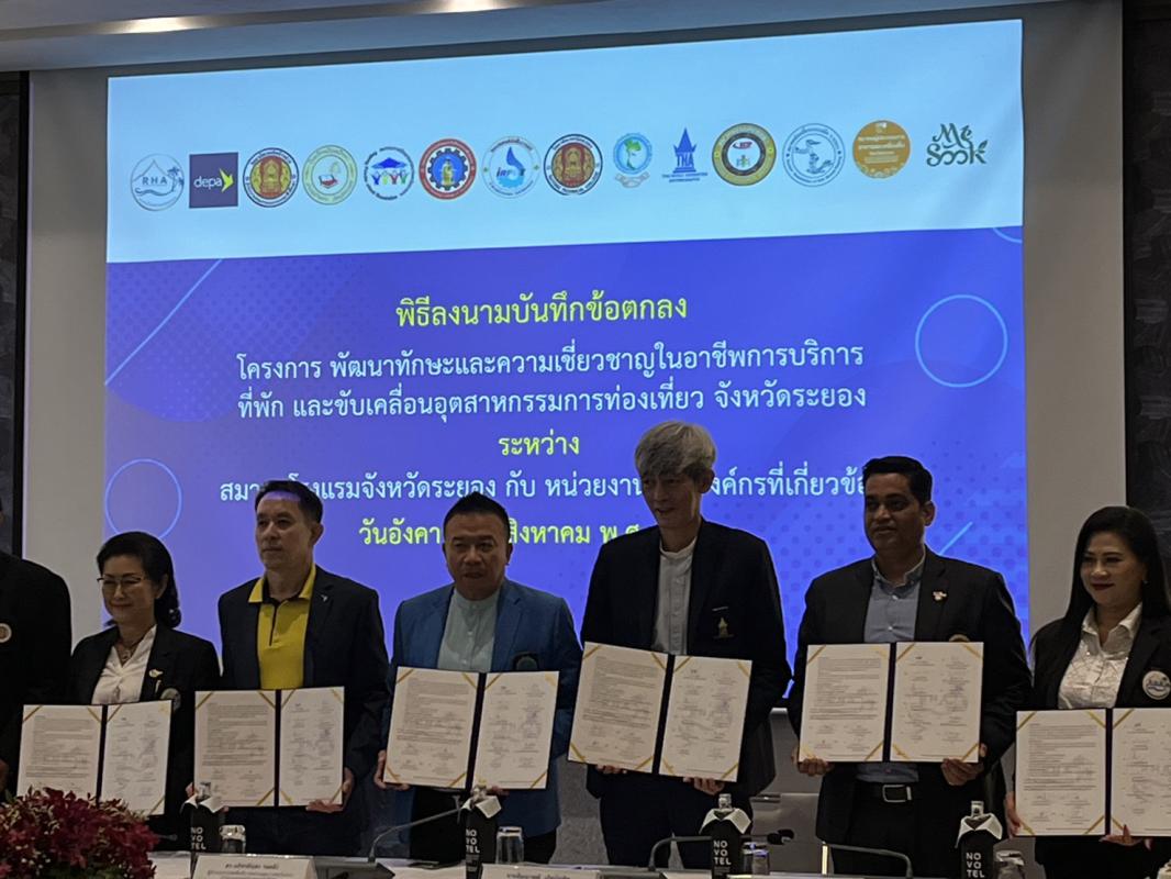 วันที่ 8 สิงหาคม 2566 เวลา 10.00 น. ดร.ปิยะ ปิตุเตชะ นายกองค์การบริหารส่วนจังหวัดระยอง มอบหมายให้นายมนตรี ชนะชัยวิบูลวัฒน์ ที่ปรึกษานายก อบจ. เข้าร่วมเป็นเกียรติในพิธีลงนาม MOU ของสมาคมโรงแรมจังหวัดระยอง โดยมีนางพิศมัย ศุภนันตฤกษ์ นายกสมาคมโรงแรมจังหวัดระยอง ร่วมลงนามบันทึกความร่วมมือ MOU กับภาคีเครือข่ายหน่วยงานและองค์กรที่เกี่ยวข้องจำนวน 13 หน่วยงาน คือ สำนักงานส่งเสริมเศรษฐกิจดิจิทัล(depa), สมาคมโรงแรมไทยภาคตะวันออก, สมาคมธุรกิจท่องเที่ยวภายในประเทศ, สมาคมอินเดียพัทยา, สมาคมท่องเที่ยวเกาะเสม็ด, สมาคมการศึกษาเอกชนจังหวัดระยอง, สมาคมผู้ประกอบการอาหารและเครื่องดื่มจังหวัดระยอง, วิสาหกิจชุมชนกลุ่มเกษตรผลิตไม้กฤษณา, วิทยาลัยเทคโนโลยีและอาชีวศึกษาตากสินระยอง, วิทยาลัย เทคนิคระยอง, วิทยาลัยเทคนิคบ้านค่าย, วิทยาลัยเทคโนโลยีไออาร์พีซี, โรงเรียนวิบูลวิทยา ร่วมลงนามในบันทึกข้อตกลงดังกล่าว