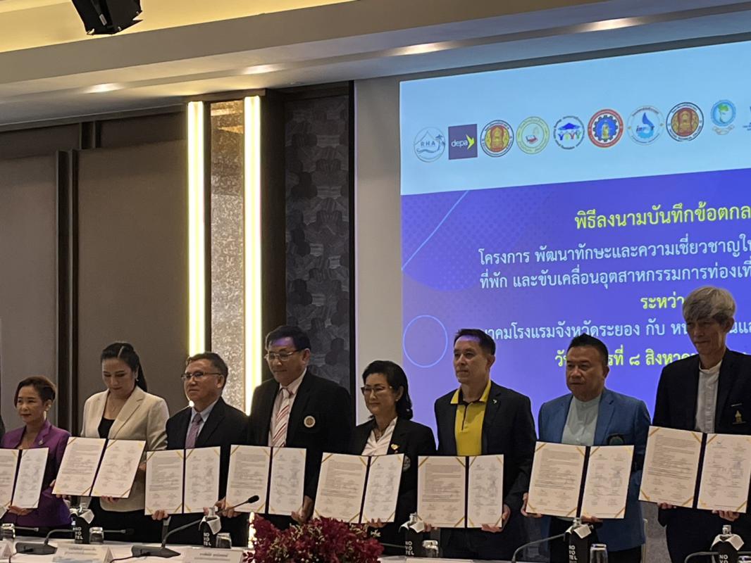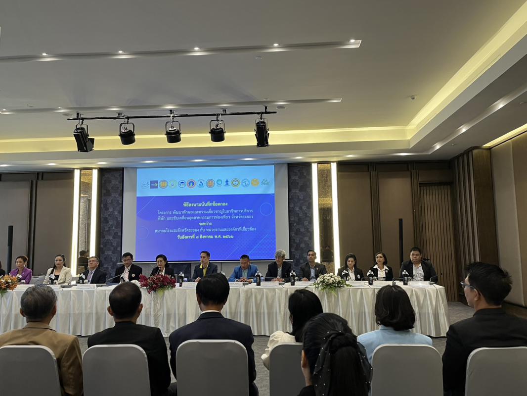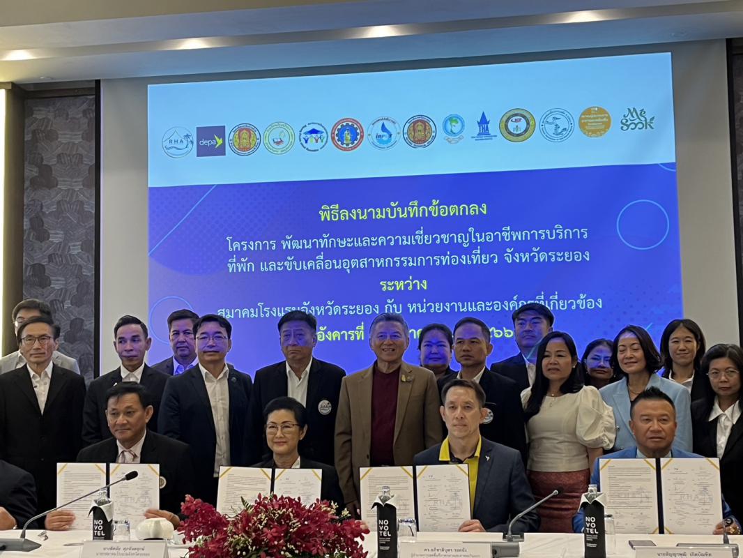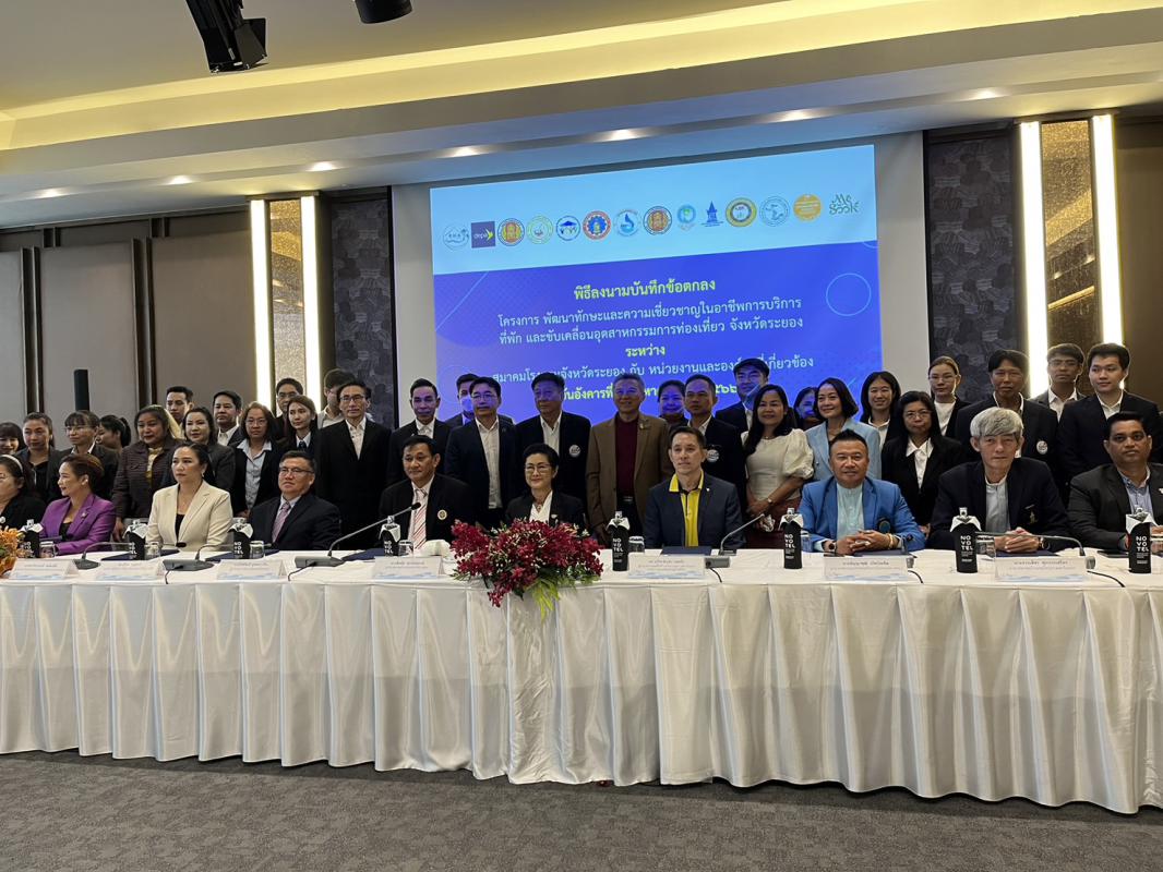 วันที่ 8 สิงหาคม 2566 เวลา 10.00 น. ดร.ปิยะ ปิตุเตชะ นายกองค์การบริหารส่วนจังหวัดระยอง มอบหมายให้นายมนตรี ชนะชัยวิบูลวัฒน์ ที่ปรึกษานายก อบจ. เข้าร่วมเป็นเกียรติในพิธีลงนาม MOU ของสมาคมโรงแรมจังหวัดระยอง โดยมีนางพิศมัย ศุภนันตฤกษ์ นายกสมาคมโรงแรมจังหวัดระยอง ร่วมลงนามบันทึกความร่วมมือ MOU กับภาคีเครือข่ายหน่วยงานและองค์กรที่เกี่ยวข้องจำนวน 13 หน่วยงาน คือ สำนักงานส่งเสริมเศรษฐกิจดิจิทัล(depa), สมาคมโรงแรมไทยภาคตะวันออก, สมาคมธุรกิจท่องเที่ยวภายในประเทศ, สมาคมอินเดียพัทยา, สมาคมท่องเที่ยวเกาะเสม็ด, สมาคมการศึกษาเอกชนจังหวัดระยอง, สมาคมผู้ประกอบการอาหารและเครื่องดื่มจังหวัดระยอง, วิสาหกิจชุมชนกลุ่มเกษตรผลิตไม้กฤษณา, วิทยาลัยเทคโนโลยีและอาชีวศึกษาตากสินระยอง, วิทยาลัย เทคนิคระยอง, วิทยาลัยเทคนิคบ้านค่าย, วิทยาลัยเทคโนโลยีไออาร์พีซี, โรงเรียนวิบูลวิทยา ร่วมลงนามในบันทึกข้อตกลงดังกล่าว