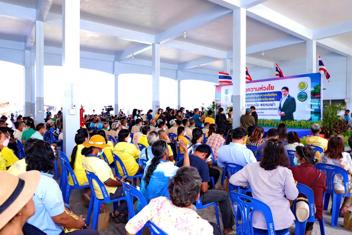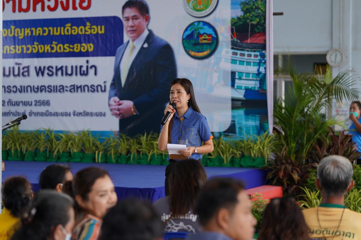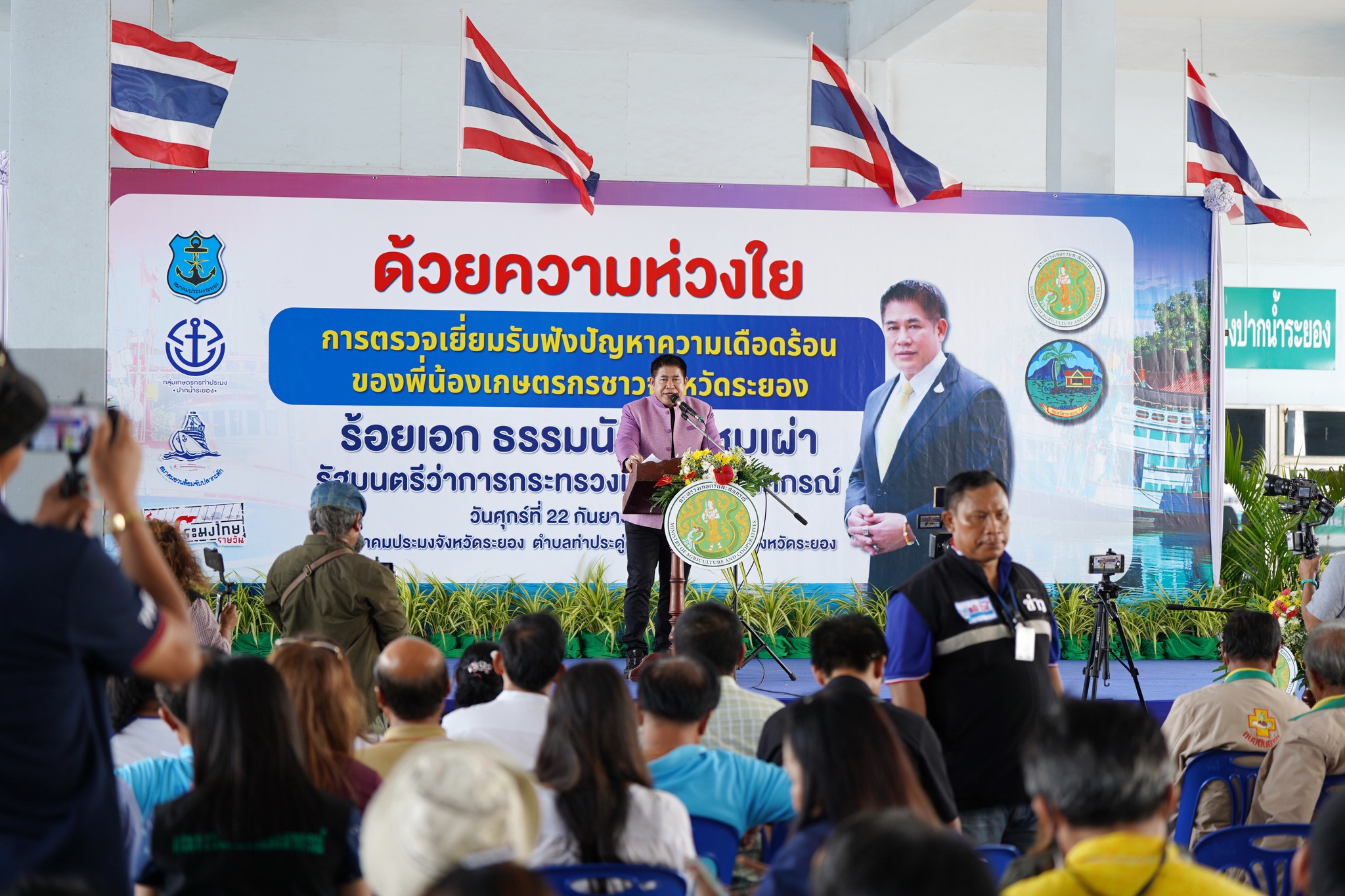 วันที่ 22 กันยายน 2566 เวลา 13.00 น. ร้อยเอก ธรรมนัส พรหมเผ่า รัฐมนตรีว่าการกระทรวงเกษตรและสหกรณ์ ได้เดินทางมาตรวจราชการในพื้นที่จังหวัดระยอง เพื่อร่วมรับฟังปัญหาและความเดือดร้อนของพี่น้องชาวเกษตรกรจังหวัดระยอง พร้อมมอบนโยบายและแนวทางการแก้ไขปัญหา เพื่อนำไปสู่การพัฒนาในด้านการเกษตร โดยมี นายไตรภพ วงศ์ไตรรัตน์ ผู้ว่าราชการจังหวัดระยอง พร้อมด้วย นายปิยะ ปิตุเตชะ นายกองค์การบริหารส่วนจังหวัดระยอง, นายประสานต์ พฤกษาชาติ รองนายองค์การบริหารส่วนจังหวัดระยอง (2), นายเศรษฐเกียรติ กระจ่างวงษ์ รองปลัดกระทรวงเกษตรและสหกรณ์, นายบัญชา สุขแก้ว รองอธิบดีกรมประมง, ดร.วิณะโรจน์ ทรัพย์ส่งสุข เลขาธิการสำนักงานการปฏิรูปที่ดินเพื่อเกษตรกรรม, นายพรศักดิ์ แย้มกลิ่น นายกสมาคมประมงระยอง หัวหน้าส่วนราชการต่างๆ และเจ้าหน้าที่ที่เกี่ยวข้องร่วมให้การต้อนรับโดยพร้อมเพรียงกัน ณ สมาคมประมงจังหวัดระยอง ตำบลท่าประดู่ อำเภอเมือง จังหวัดระยอง