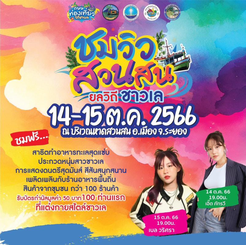 องค์การบริหารส่วนจังหวัดระยองขอเชิญชวนเที่ยวงาน "ชมวิวสวนสน ยลวิถีชาวเล" ภายในงานพบกับการสาธิตทำอาหารทะเล การประกวดหนุ่มสาวชาวเล อาหารพื้นถิ่น และสินค้าจากชุมชนกว่า 100 ร้านค้า พร้อมรับชมคอนเสิร์ตจาก เอิ๊ต ภัทรวี และ เบล วิริศรา ซึ่งงานจะจัดขึ้นระหว่างวันที่ 14-15 ตุลาคม 2566 ณ บริเวณหาดสวนสน อำเภอเมืองระยอง จังหวัดระยอง