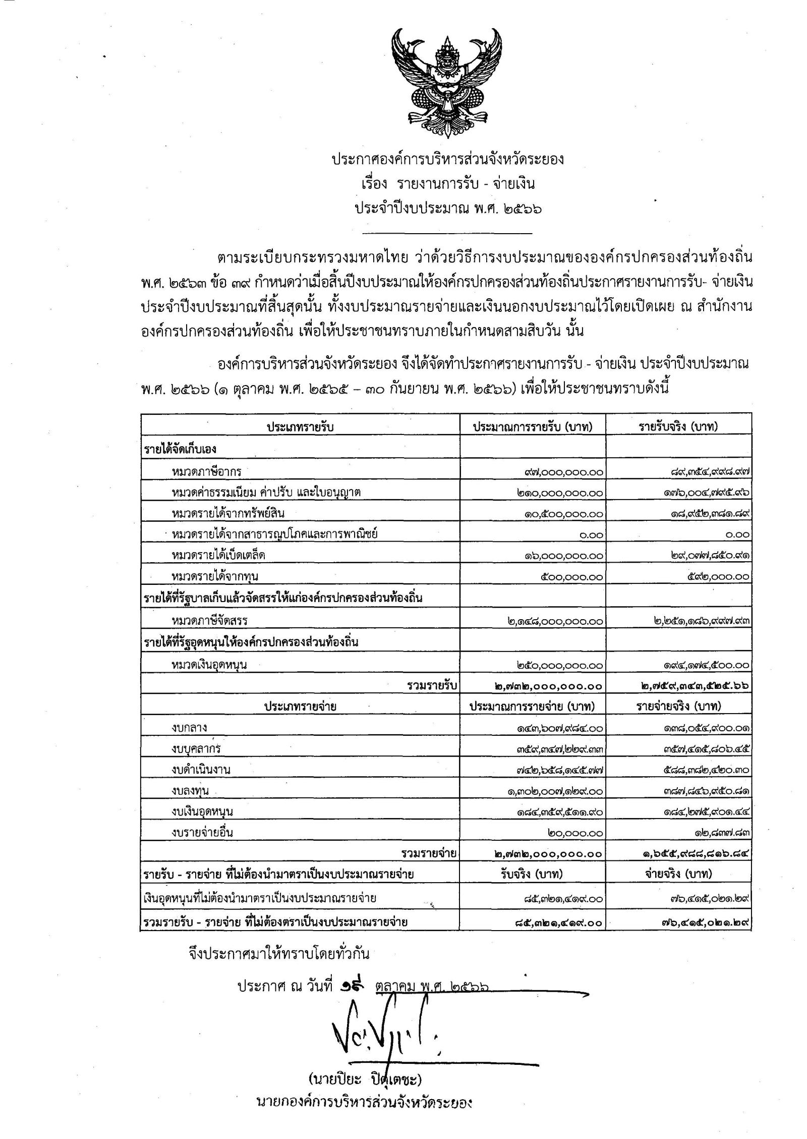 ประกาศองค์การบริหารส่วนจังหวัดระยอง เรื่อง รายงานการรับ - จ่ายเงิน ประจำปีงบประมาณ พ.ศ. ๒๕๖๖
