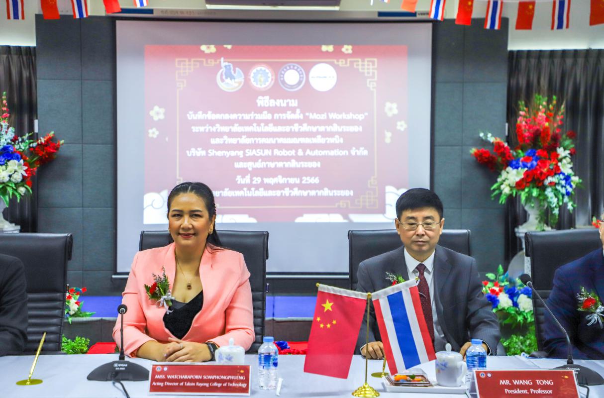 วันที่ 29 พฤศจิกายน 2566 เวลา 09.00 น. นางสาววัชราภรณ์ สมพงษ์ผึ้ง ผู้อำนวยการสถานศึกษาฯ ให้เกียรติเป็นประธานในพิธีลงนามบันทึกข้อตกลง (MOU) โครงการจัดตั้ง “Mozi Workshop” ระหว่างวิทยาลัยการคมนาคมมณฑลเหลียวหนิง บริษัท Shenyang SIASUN Robot & Automation จำกัด และศูนย์ภาษาตากสินระยอง พร้อมด้วย คณะผู้บริหาร คณะครู และผู้ที่เกี่ยวข้องเข้าร่วมกันอย่างพร้อมเพรียง ณ ห้องประชุมชั้น 4 วิทยาลัยเทคโนโลยีและอาชีวศึกษาตากสินระยอง