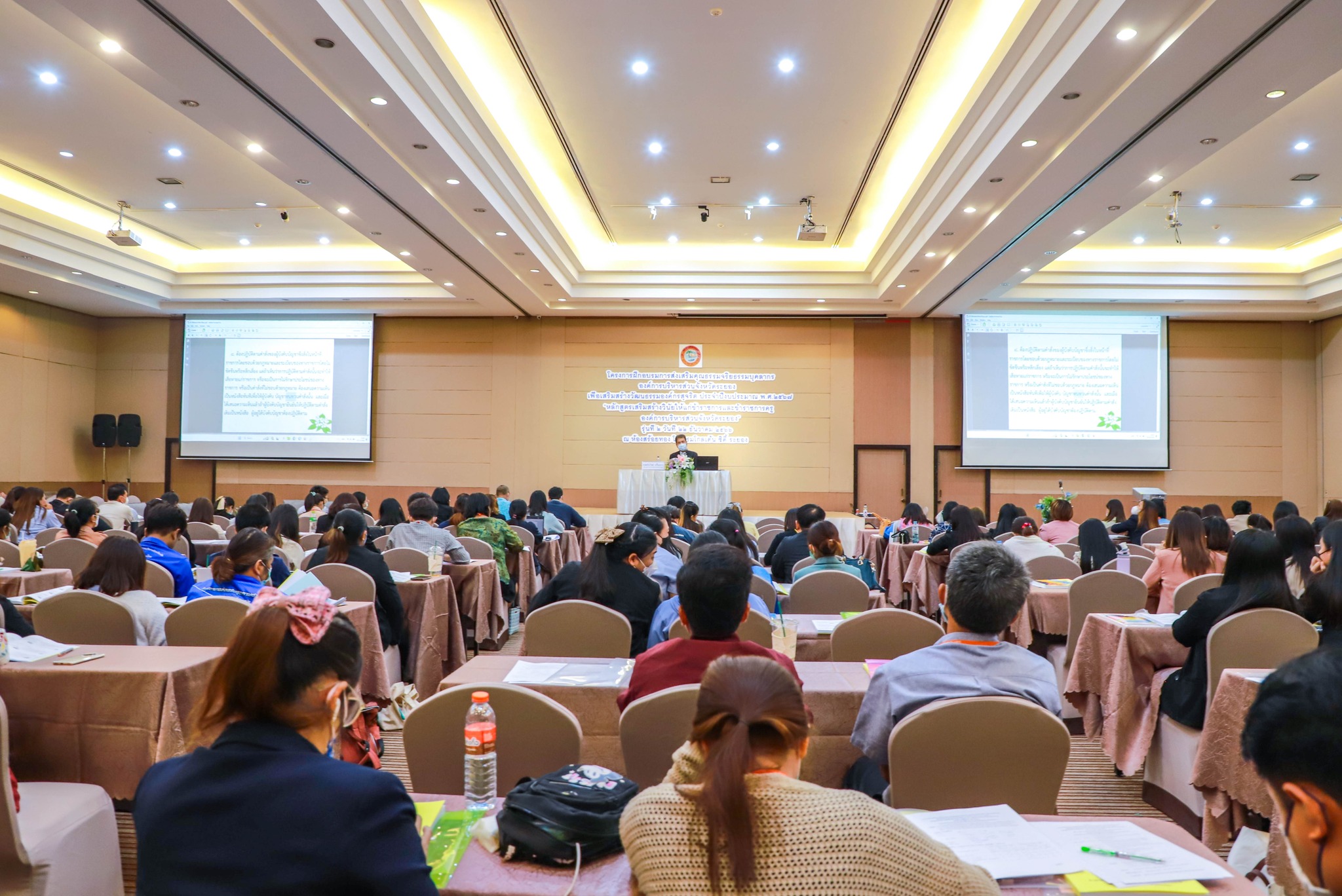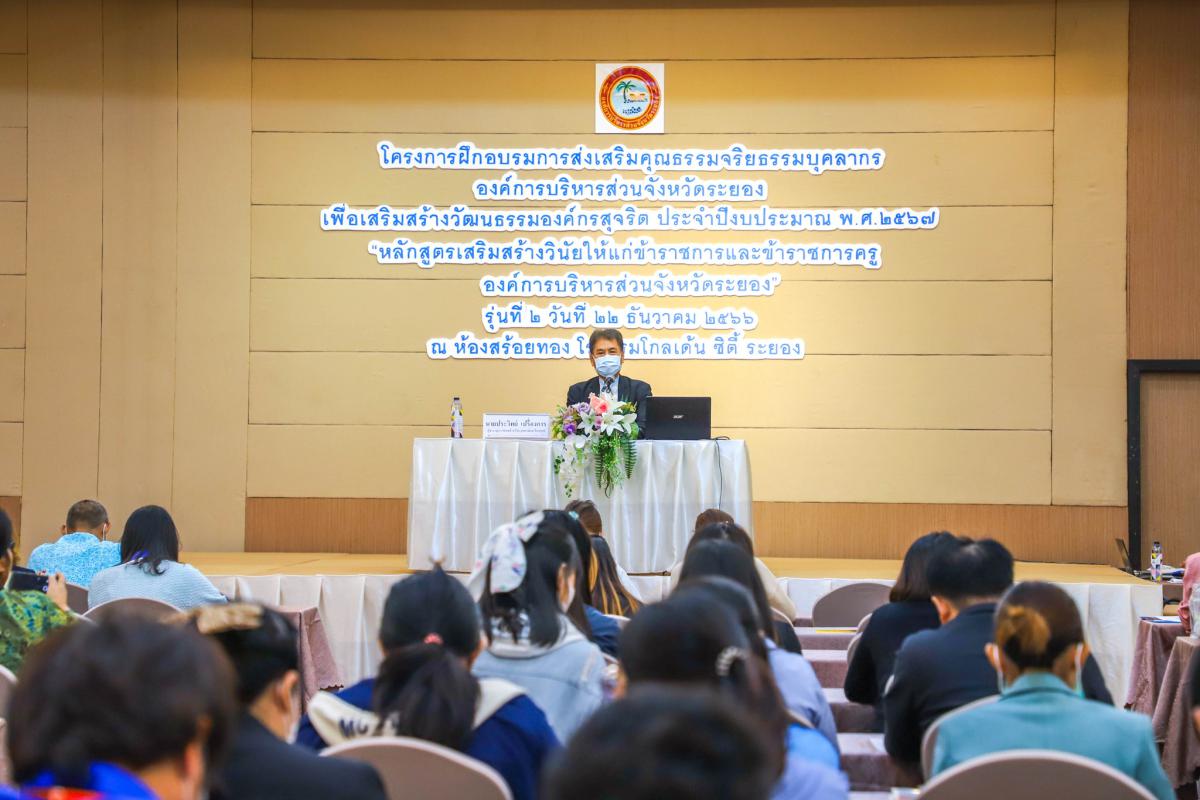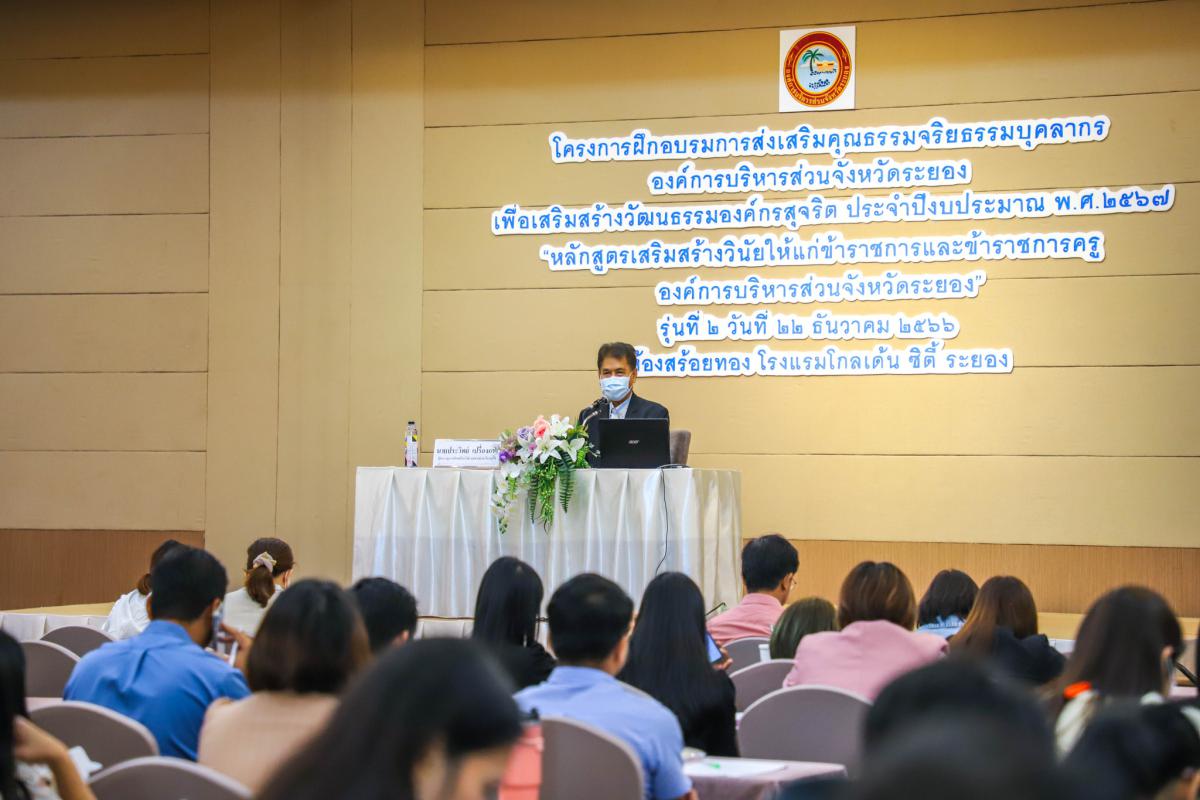 วันที่ 22 ธันวาคม 2566 เวลา 09.00 น อบจ.ระยองได้จัดโครงการฝึกอบรมการส่งเสริมคุณธรรมจริยธรรมบุคลากรองค์การบริหารส่วนจังหวัดระยอง เพื่อเสริมสร้างวัฒนธรรมองค์กรสุจริต ประจำปีงบประมาณ พ.ศ.2567 “หลักสูตรเสริมสร้างวินัยให้แก่ข้าราชการและข้าราชการครูองค์การบริหารส่วนจังหวัดระยอง”(รุ่นที่ 2) ซึ่งอบจ.ระยอง ได้เล็งเห็นความสำคัญของการเสริมสร้างคุณธรรมจริยธรรม และเพื่อเสริมสร้างวัฒนธรรมองค์กรสุจริตการปฏิบัติงานขององค์กร จึงได้ดำเนินการจัดการอบรมในครั้งนี้ขึ้น โดยมุ่งหวังให้ผู้เข้าอบรมมีคุณธรรมจริยธรรม มีจิตสำนึกที่ดี ซึ่งจะส่งผลให้การปฏิบัติงานขององค์กรมีประสิทธิภาพมากยิ่งขึ้น จนนำไปสู่การพัฒนาตนเองพัฒนาทีมงาน และพัฒนาองค์กรได้อย่างยั่งยืน ซึ่งในช่วงอบรมได้มีการบรรยาย ในหัวข้อ "เรื่องความรู้เกี่ยวกับวินัยและการรักษาวินัย" โดยได้รับเกียรติจาก นายประวิทย์ เปรื่องการ ผู้ชำนาญการพิเศษด้านวินัย อุธรณ์และร้องทุกข์ เป็นวิทยากร ในช่วงเช้าและในช่วงบ่าย ระหว่างการอบรมได้มีการแลกเปลี่ยนความรู้เพื่อนำความรู้ที่ได้ไปประยุกต์ใช้ในการปฏิบัติงานได้อย่างมีประสิทธิภาพต่อไป ณ ห้องสร้อยทอง โรงแรมโกเด้น ซิตี้ ระยอง
