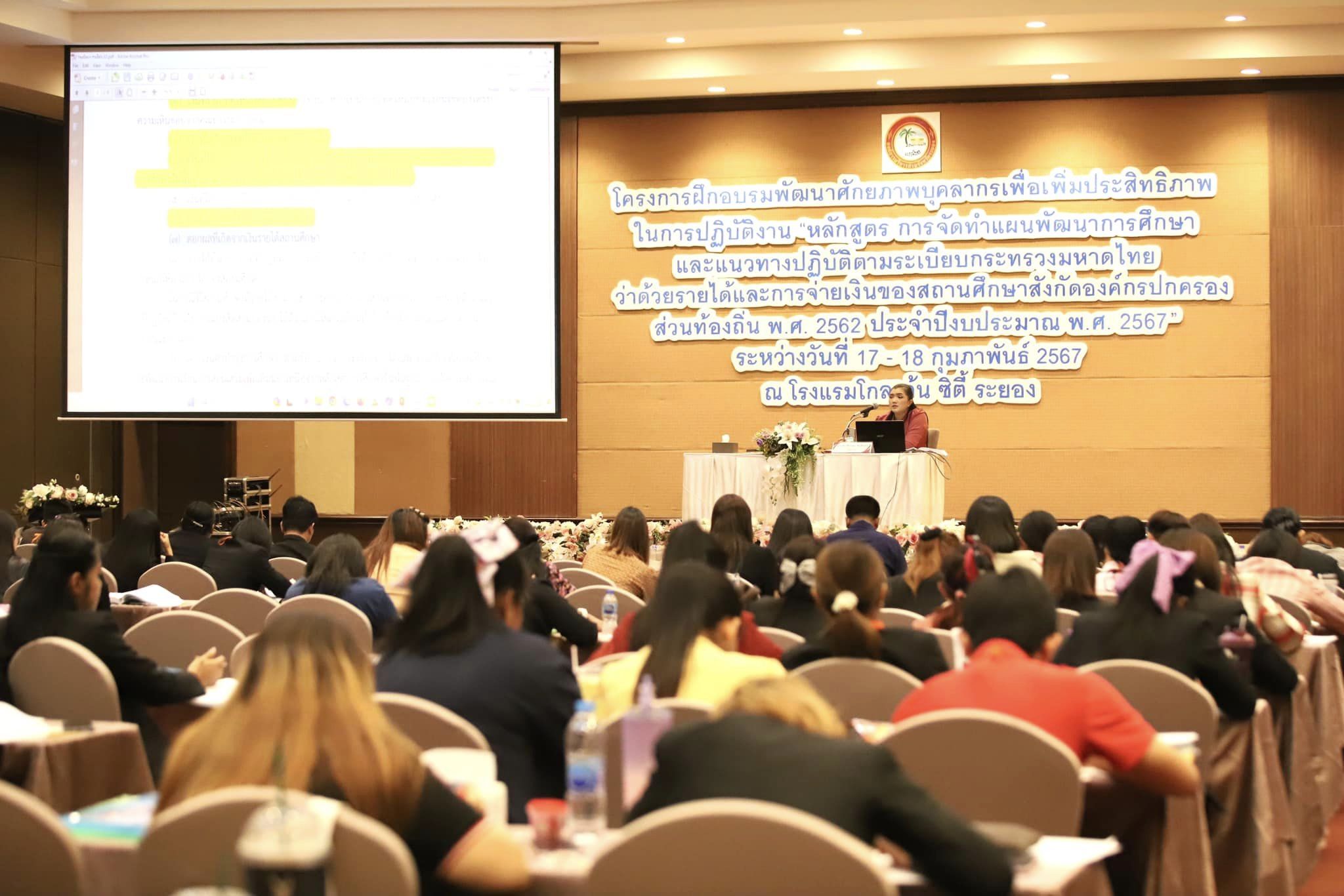 วันที่ 18 กุมภาพันธ์ 2567 เวลา 09.00 น. องค์การบริหารส่วนจังหวัดระยองได้จัดโครงการฝึกอบรมพัฒนาศักยภาพบุคลากรเพื่อเพิ่มประสิทธิภาพในการปฏิบัติงาน “หลักสูตร การจัดทำแผนพัฒนาการศึกษาและแนวทางปฏิบัติตามระเบียบกระทรวงมหาดไทยว่าด้วยรายได้และการจ่ายเงินของสถานศึกษาสังกัดองค์กรปกครองส่วนท้องถิ่น พ.ศ. 2562 ประจำปีงบประมาณ พ.ศ. 2567“ โดยมีวัตถุประสงค์ เพื่อเพิ่มพูนความรู้และสร้างความเข้าใจเกี่ยวกับการจัดทำแผนพัฒนาการศึกษา เทคนิคและวิธีการเขียนโครงการ การใช้จ่ายเงินรายได้ของสถานศึกษา และระเบียบที่เกี่ยวข้องได้อย่างถูกต้องตามระเบียบกฎหมายที่กำหนด ซึ่งได้รับเกียรติจากนางสาวพีระนุช พิมพ์บุตร วิทยากรเครือข่ายการจัดแผนและงบประมาณทางการศึกษาขององค์กรปกครองส่วนท้องถิ่น กรมส่งเสริมการปกครองส่วนท้องถิ่น กระทรวงมหาดไทย เป็นวิทยากรบรรยายให้ความรู้ ณ โรงแรมโกลเด้น ซิตี้ ระยอง