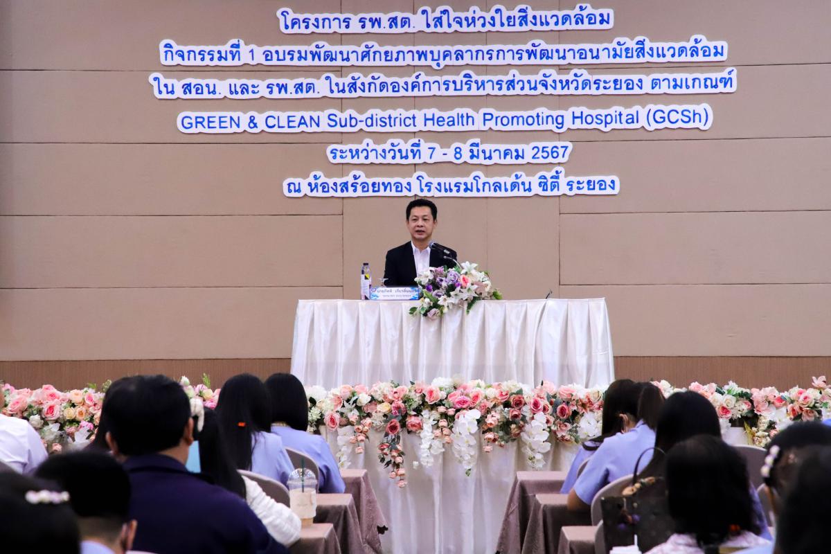 วันที่ 7 มีนาคม 2567 เวลา 09.00 น. นายกิตติ เกียรติ์มนตรี รองนายกองค์การบริหารส่วนจังหวัดระยอง กล่าวเปิด "โครงการ รพ.สต. ใส่ใจห่วงใยสิ่งแวดล้อม" กิจกรรมที่ 1 อบรมพัฒนาศักยภาพบุคลากรการพัฒนาอนามัยสิ่งแวดล้อมใน สอน.และ รพ.สต. ในสังกัดองค์การบริหารส่วนจังหวัดระยอง ตามเกณฑ์ Green & Clean Sub-district Health Promoting Hospital (GCSh) โดยมีนายชัยวัฒน์ จัตตุพร เลขานุการนายกองค์การบริหารส่วนจังหวัดระยอง เป็นผู้กล่าวถึงวัตถุประสงค์ของการจัดโครงการดังกล่าว พร้อมกันนี้นายสุริยะ ศิริวัฒน์ รก.ผอ.กองสาธารณสุข ให้เกียรติร่วมเปิดโครงการในครั้งนี้ด้วย