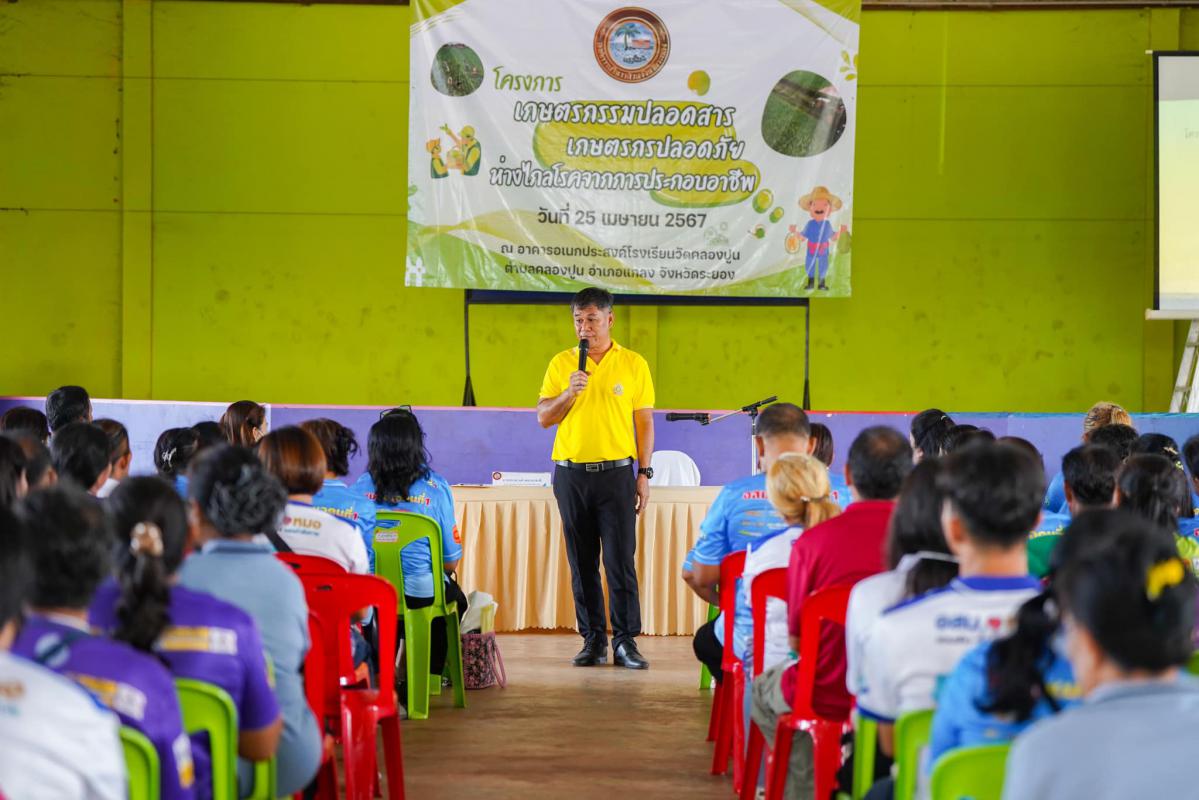 วันที่ 25 เมษายน 2567 เวลา 09.00 น. นายประสานต์ พฤกษาชาติ รองนายกองค์การบริหารส่วนจังหวัดระยอง เป็นประธานในพิธีเปิดโครงการเกษตรกรรมปลอดสาร เกษตรกรปลอดภัย ห่างไกลโรคจากการประกอบอาชีพ โดยมี นายสุริยะ ศิริวัฒน์ โรงพยาบาลส่งเสริมสุขภาพตำบล รักษาราชการแทน ผู้อำนวยการกองสาธารณสุข พร้อมด้วย คณะวิทยากร จากกลุ่มงานอาชีวเวชกรรม ผู้นำชุมชน แกนนำสุขภาพจังหวัดระยอง และผู้ที่เกี่ยวข้องเข้าร่วมพิธีเปิดโครงการฯ อย่างพร้อมเพรียงกัน จากรายงานระบบคลังข้อมูลด้านการแพทย์ (HDC) กระทรวงสาธารณสุข อัตราการป่วยจากพิษสารกำจัดศัตรูพืช พ.ศ. 2565 พบว่าจังหวัดระยอง มีจำนวนผู้ป่วย 25 ราย คิดเป็นร้อยละ 4.14 จากประชากรเป้าหมายทั้งหมด ซึ่งสารเคมีกำจัดศัตรูพืช สามารถทำอันตรายต่อสุขภาพร่างกายได้ทั้งมนุษย์และสัตว์ คือ ระบบอวัยวะภายในร่างกาย จึงได้จัดทำโครงการนี้ขึ้น โดยมีวัตถุประสงค์ เพื่อสร้างความรู้ ความเข้าใจเกี่ยวกับโรคจากการประกอบอาชีพอันเนื่องมาจากสารเคมีกำจัดศัตรูพืช และเพื่อพัฒนาศักยภาพแกนนำด้านสุขภาพ ให้มีความรู้ และมีทักษะในการปรับเปลี่ยนพฤติกรรมที่ถูกต้องเหมาะสมเกี่ยวกับการใช้สารเคมีที่ถูกวิธี และปลอดอันตรายต่อสุขภาพ โดยได้รับความร่วมมือจากวิทยากร จากกลุ่มงานอาชีวเวชกรรม โรงพยาบาลระยอง มาให้ความรู้เกี่ยวกับโรคจากการทำงานในอาชีพเกษตรกร ความปลอดภัยในการใล้สารเคมี และการใช้อุปกรณ์ป้องกันเพื่อความปลอดภัย รวมถึงการปฐมเบื้องต้น เป็นต้น ณ อาคารอเนกประสงค์ โรงเรียนวัดคลองปูน อำเภอแกลง จังหวัดระยอง