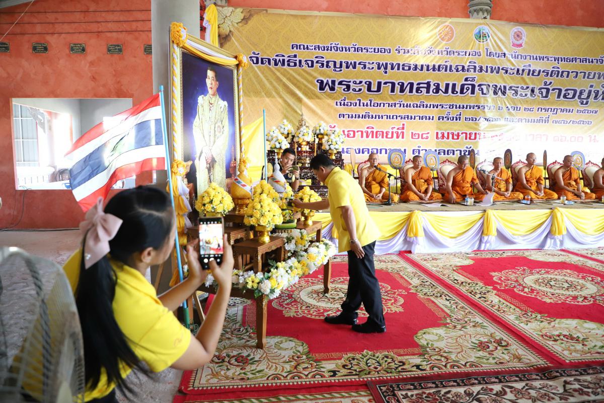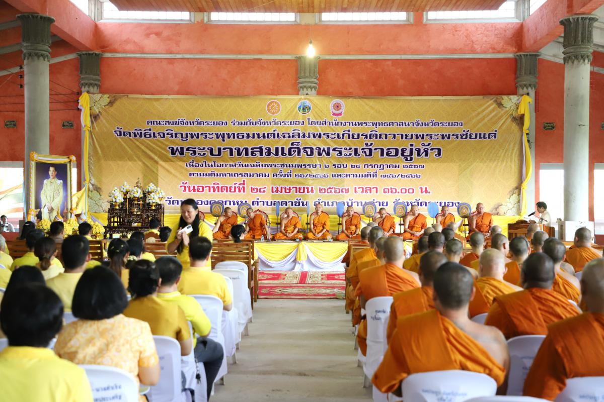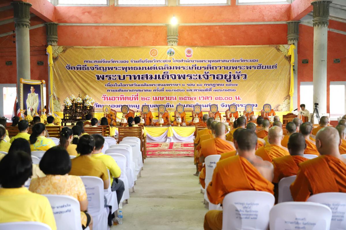 วันที่ 28 เมษายน 2567 เวลา 16.00 น. นายกำธร เวหน รองผู้ว่าราชการจังหวัดระยอง เป็นประธานจุดธูป เทียน บูชาพระรัตนตรัย เปิดกรวยกระทงดอกไม้เบื้องหน้าพระบรมฉายาลักษณ์ พระบาทสมเด็จพระเจ้าอยู่หัว พร้อมทั้งร่วมพิธีเจริญจิตภาวนาถวายพระพรชัยมงคลฯ เนื่องในพิธีเจริญพระพุทธมนต์เฉลิมพระเกียรติถวายพระพรชัยมงคลแด่ พระบาทสมเด็จพระเจ้าอยู่หัว เนื่องในโอกาสวันเฉลิมพระชนมพรรษา 6 รอบ 28 กรกฏาคม 2567 พร้อมด้วย หัวหน้าส่วนราชการ เจ้าหน้าที่รัฐ และหน่วยงานราชการในจังหวัดระยอง เข้าร่วมพิธีโดยพร้อมเพรียงกัน ซึ่งพิธีดังกล่าวจัดขึ้น เพื่อเป็นการส่งเสริมให้พสกนิกรทุกหมู่เหล่าร่วมกันทำความดี ถวายพระราชกุศล และเป็นการแสดงถึงความจงรักภักดีต่อสถาบันพระมหากษัตริย์ ณ วัดหนองคอกหมู ตำบลตาขัน อำเภอบ้านค่าย จังหวัดระยอง