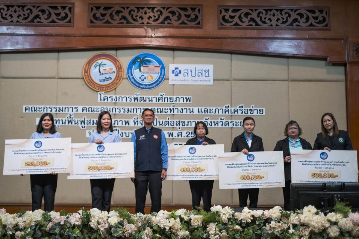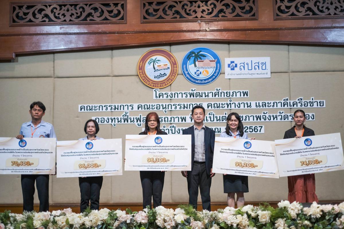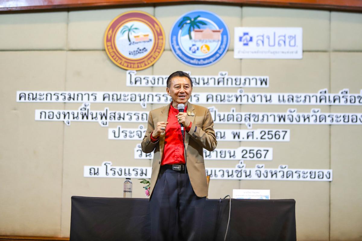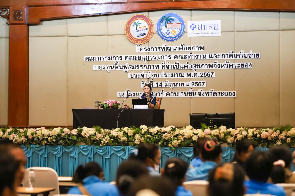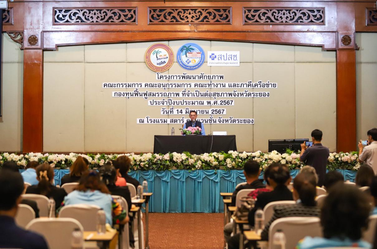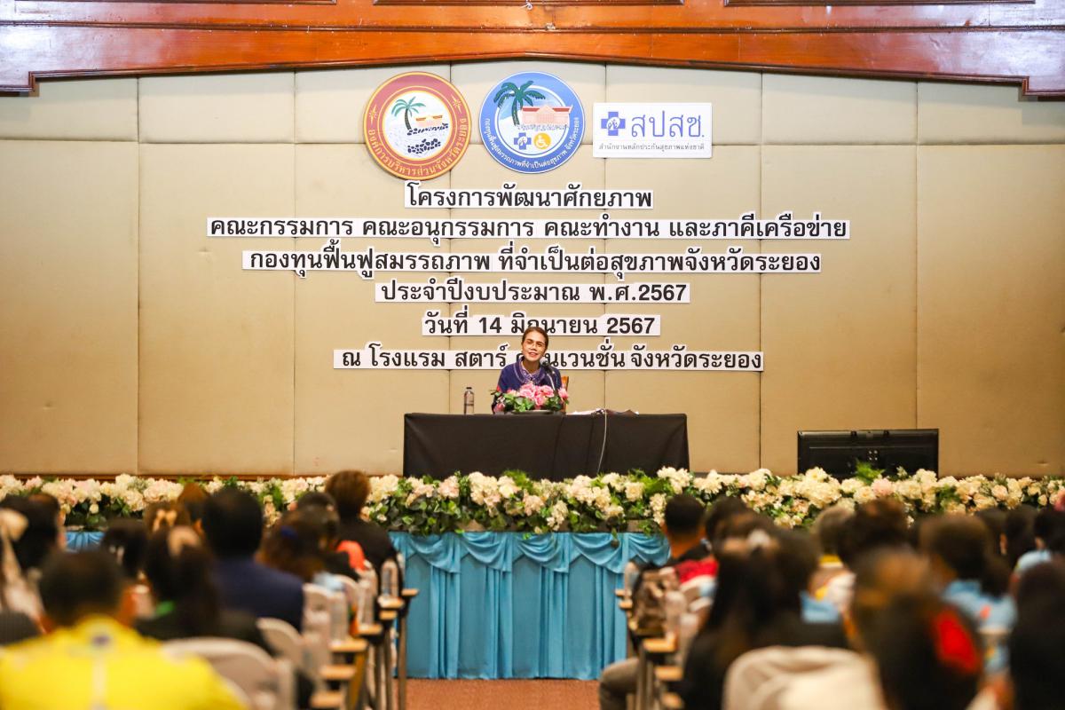 โครงการพัฒนาศักยภาพคณะกรรมการ คณะอนุกรรมการ คณะทำงาน และภาคีเครือข่าย กองทุนฟื้นฟูสมรรถภาพที่จำเป็นต่อสุขภาพจังหวัดระยอง ประจำปีงบประมาณ พ.ศ. 2567 จัดขึ้นเพื่อเสริมสร้างทักษะการบริหารจัดการกองทุนฟื้นฟูสมรรถภาพที่จำเป็นต่อสุขภาพจังหวัดระยอง และเพื่อเป็นการบูรราการด้านการฟื้นฟูสุขภาพกับหน่วยบริการ และหน่วยงานที่เกี่ยวข้อง รวมไปถึงยังเป็นการให้ผู้ปฏิบัติงานได้มีความรู้ ความเข้าใจในกฎหมาย และข้อระเบียบที่เกี่ยวข้อง โดยได้รับเกียรติจาก นางสาวจุฑามาศ ชาติเกษม นักพัฒนาสังคมชำนายการพิเศษ หัวหน้ากลุ่มการพัฒนาสังคมและสวัสดิการ, นายสุริยัน สกุลศิริไพบูลย์ ผู้จัดการกลุ่มภารกิจ สปสช. เขต 6 ระยอง, นางสาวฟ้านาวิน รอดเที่ยง นักบริหารงานหลักประกันสุขภาพ สปสช. เขต 6 ระยอง และนายอธิราช อิงประสาร รองประธานศูนย์ปันน้ำใจสาธุ มูลนิธิโรงพยาบาลสมเด็จพระนางเจ้าสิริกิติ์ ร่วมเป็นวิทยากรให้ความรู้แก่ผู้เข้าร่วมโครงการ ณ ห้องประชุมสุนทรภู่ โรงแรมสตาร์ คอนเวนชั่น อำเภอเมืองระยอง จังหวัดระยอง
