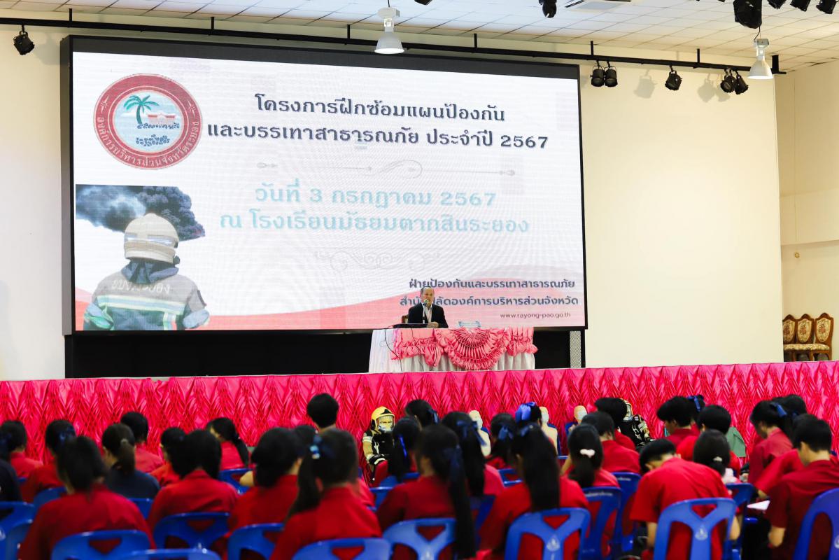 วันที่ 3 กรกฎาคม 2567 เวลา 08.30 น. นายสมบัติ มุมทอง หัวหน้าสำนักปลัดองค์การบริหารส่วนจังหวัดระยอง เป็นประธานในพิธีเปิดโครงการฝึกซ้อมแผนป้องกันและบรรเทาสาธารณภัย ประจำปี 2567 โดยมี จ.อ.โสภณ อบรม หัวหน้าฝ่ายป้องกันและบรรเทาสาธารณภัย เป็นผู้กล่าววัตถุประสงค์โครงการฯ พร้อมด้วย คณะครู นักเรียน และเจ้าหน้าที่ที่เกี่ยวข้องเข้าร่วมพิธีเปิดอย่างพร้อมเพรียงกัน ณ โรงเรียนมัธยมตากสินระยอง อำเภอเมืองระยอง จังหวัดระยอง