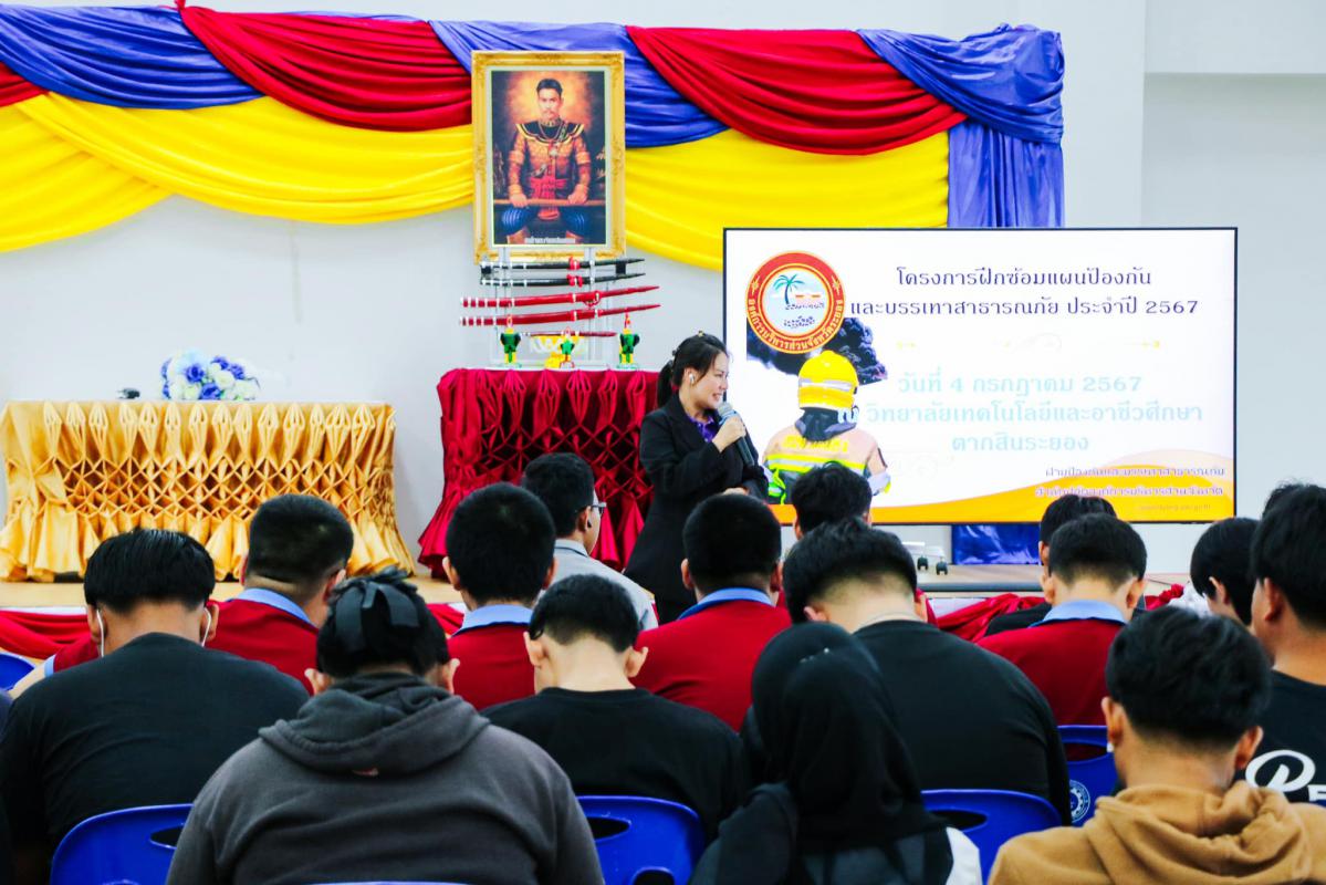 วันที่ 4 กรกฎาคม 2567 เวลา 08.30 น. นายสมบัติ มุมทอง หัวหน้าสำนักปลัดองค์การบริหารส่วนจังหวัดระยอง เป็นประธานในพิธีเปิดโครงการฝึกซ้อมแผนป้องกันและบรรเทาสาธารณภัย ประจำปี 2567 โดยมี จ.อ.โสภณ อบรม หัวหน้าฝ่ายป้องกันและบรรเทาสาธารณภัย เป็นผู้กล่าววัตถุประสงค์โครงการฯ พร้อมด้วย คณะอาจารย์ นักศึกษา และเจ้าหน้าที่ที่เกี่ยวข้องเข้าร่วมพิธีเปิดอย่างพร้อมเพรียงกัน ณ วิทยาลัยเทคโนโลยีและอาชีวศึกษาตากสินระยอง อำเภอเมืองระยอง จังหวัดระยอง