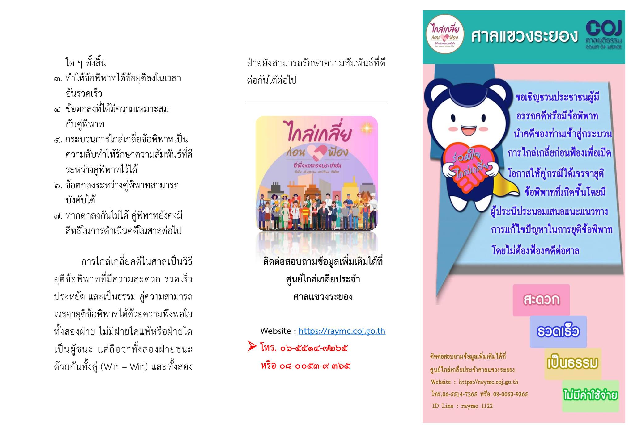 ประชาสัมพันธ์แผ่นพับและใบปลิวให้ความรู้เกี่ยวกับการไกล่เกลี่ยก่อนฟ้องของศาลแขวงระยอง