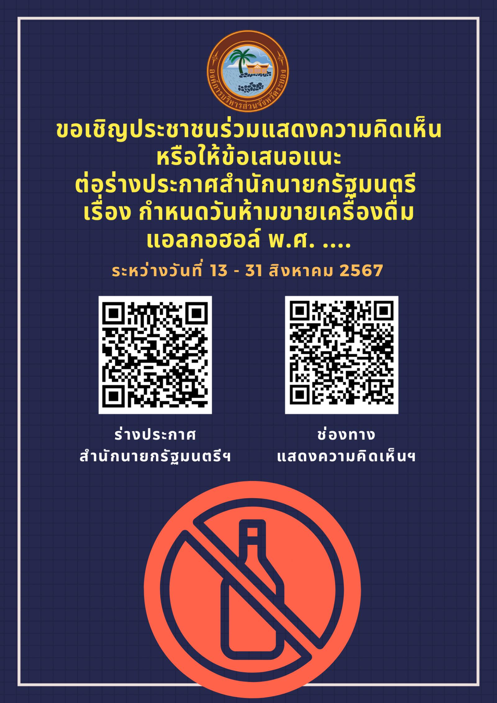 ด้วยจังหวัดระยอง มีหนังสือ ที่ รย ๐๐๒๓.๖/ว ๖๕๖ ลงวันที่ ๒๑ สิงหาคม ๒๕๖๗ แจ้งว่า สำนักงานคณะกรรมการควบคุมเครื่องดื่มแอลกอฮอล์ ได้ดำเนินการจัดทำร่างประกาศสำนักนายกรัฐมนตรี เรื่อง กำหนดวันห้ามขายเครื่องดื่มแอลกอฮอล์ พ.ศ. .... ออกตามความในมาตรา ๒๘ แห่งพระราชบัญญัติควบคุมเครื่องดื่มแอลกอฮอล์ พ.ศ. ๒๕๕๑ จึงดำเนินการเปิดรับฟังความคิดเห็นต่อร่างประกาศสำนักนายกรัฐมนตรีดังกล่าว เพื่อให้เป็นไปตามมาตรา ๗๗ ของรัฐธรรมนูญแห่งราชอาณาจักรไทย พ.ศ. ๒๕๖๐ ประกอบกับพระราชบัญญัติหลักเกณฑ์การจัดทำร่างกฎหมายและการประเมินผลสัมฤทธิ์ของกฎหมาย พ.ศ. ๒๕๖๒ ที่กำหนดให้ก่อนการตรากฎหมายทุกฉบับ หน่วยงานของรัฐพึงจัดให้มีการรับฟังความคิดเห็นของผู้เกี่ยวข้อง และนำผลการรับฟังความคิดเห็นนั้น มาประกอบการพิจารณาในกระบวนการตรากฎหมายทุกขั้นตอน จึงขอให้องค์กรปกครองส่วนท้องถิ่นร่วมแสดงความคิดเห็น หรือให้ข้อเสนอแนะต่อร่างประกาศสำนักนายกรัฐมนตรี และประชาสัมพันธ์การเปิดรับฟังความคิดเห็น ในช่วงระหว่างวันที่ ๑๓ - ๓๑ สิงหาคม ๒๕๖๗ ผ่านระบบสารสนเทศของกรมควบคุมโรค (https://forms.gle/๕๔MCoxoF1hjhj๒iw๙) เพื่อให้ประชาชนร่วมแสดงความคิดเห็นหรือให้ข้อเสนอแนะ ผ่านทางเว็บไซต์และเฟซบุ๊กขององค์การบริหารส่วนจังหวัดระยองต่อไป รายละเอียดปรากฏตามเอกสารที่แนบมาพร้อมนี้