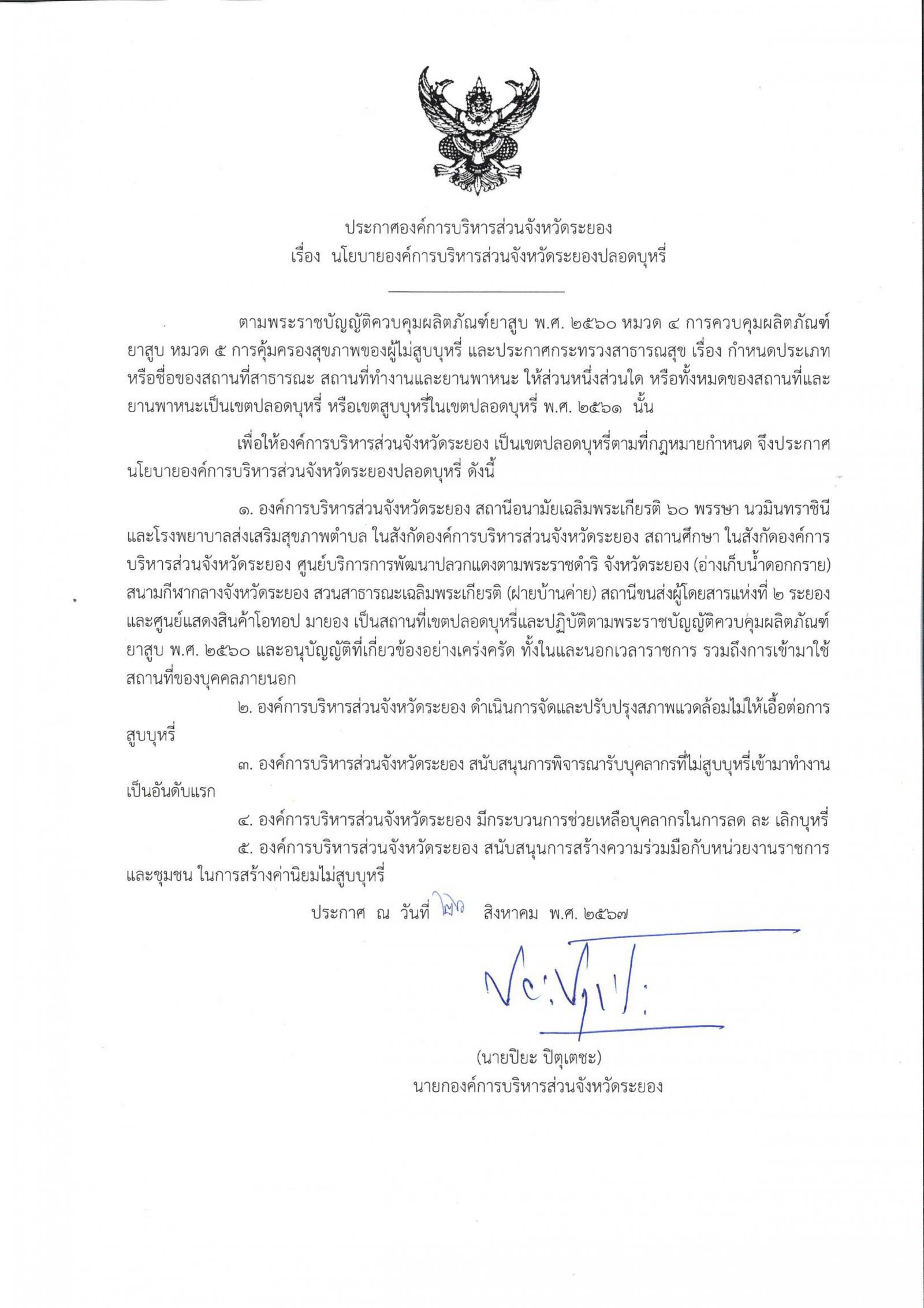 ด้วยกองสาธารณสุข ได้รับอนุมัติให้ดำเนินกิจกรรมสถานที่ราชการและสถานที่สาธารณะขององค์การบริหารส่วนจังหวัดระยองเป็นเขตปลอดบุหรี่ โดยมีวัตถุประสงค์เพื่อส่งเสริมและกระตุ้นให้บุคลากร นักเรียน นักศึกษาและบุคลากรทางการศึกษา ในสังกัดองค์การบริหารส่วนจังหวัดระยองและประชาชนทั่วไป มีการลด ละ เลิกบุหรี่ หรือผลิตภัณฑ์ยาสูบอื่น ๆ รวมทั้งกำหนดให้สถานที่ราชการและสถานที่สาธารณะขององค์การบริหารส่วนจังหวัดระยองเป็นเขตปลอดบุหรี่ ซึ่งกำหนดจัดกิจกรรมฯ ระหว่างเดือนสิงหาคม ถึงเดือนกันยายน พ.ศ. ๒๕๖๗ รายละเอียดปรากฏตามเอกสารที่แนบมาพร้อมนี้