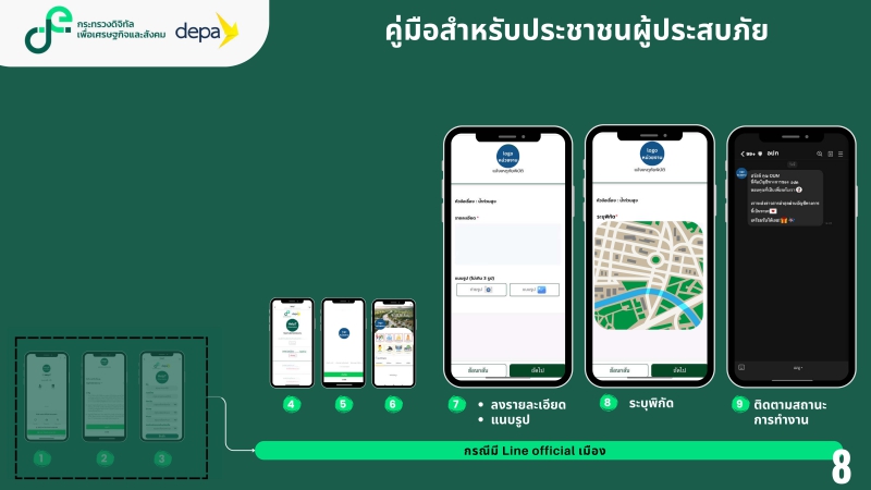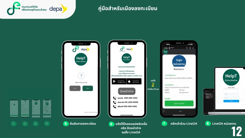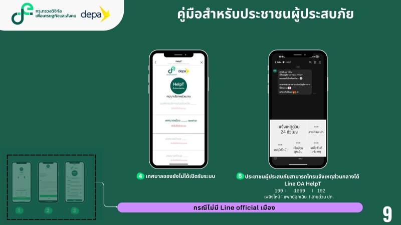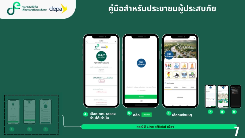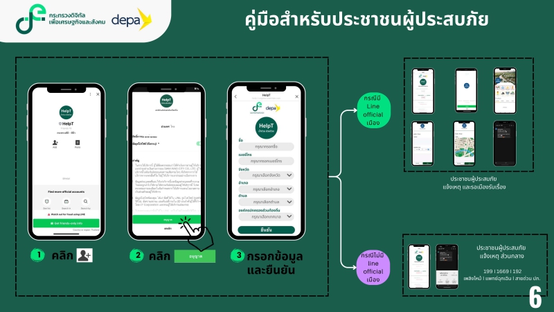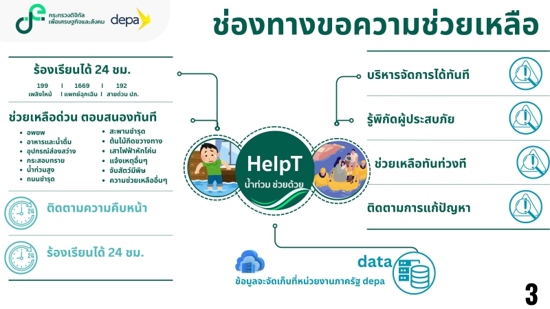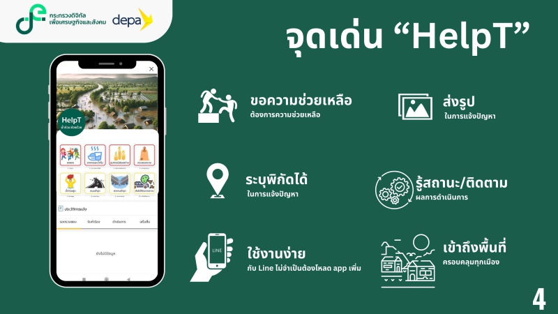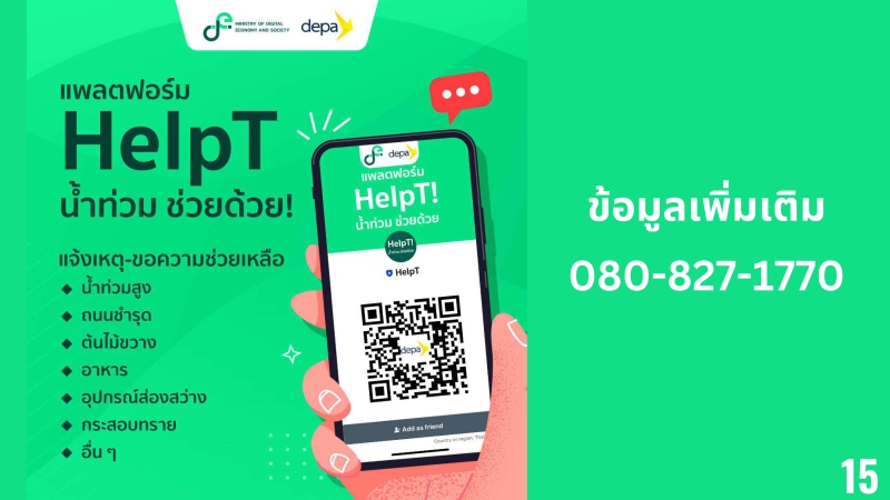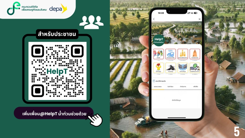 ด้วยกระทรวงดิจิทัลเพื่อเศรษฐกิจและสังคมแจ้งว่า ขณะนี้สถานการณ์อุทกภัยน้ำป่าไหลหลากและดินถล่มในพื้นที่ของประเทศไทย ส่งผลให้ประชาชนได้รับความเดือดร้อน เพื่อให้การช่วยเหลือได้อย่างทันท่วงที สำนักงานส่งเสริมเศรษฐกิจดิจิทัล ร่วมกับ บริษัท สยาม อินโน ซิตี้ จำกัด เตรียมความพร้อมในการช่วยเหลือผู้ประสบภัยผ่าน Line OA ‘Helpt น้ำท่วม ช่วยด้วย!’ ระบบรับแจ้งเหตุฉุกเฉิน บน Line Official Account สำหรับพื้นที่ที่ประสบอุทกภัย เพื่อบรรเทาสาธารณภัยใช้ในการขอความช่วยเหลือและแจ้งความเสียหาย ในพื้นที่ประสบภัย เป็นระยะเวลา ๔ เดือน สิ้นสุดวันที่ ๓๑ ธันวาคม ๒๕๖๗ หรือจนกว่าเหตุการณ์จะกลับเข้าสู่ภาวะปกติ