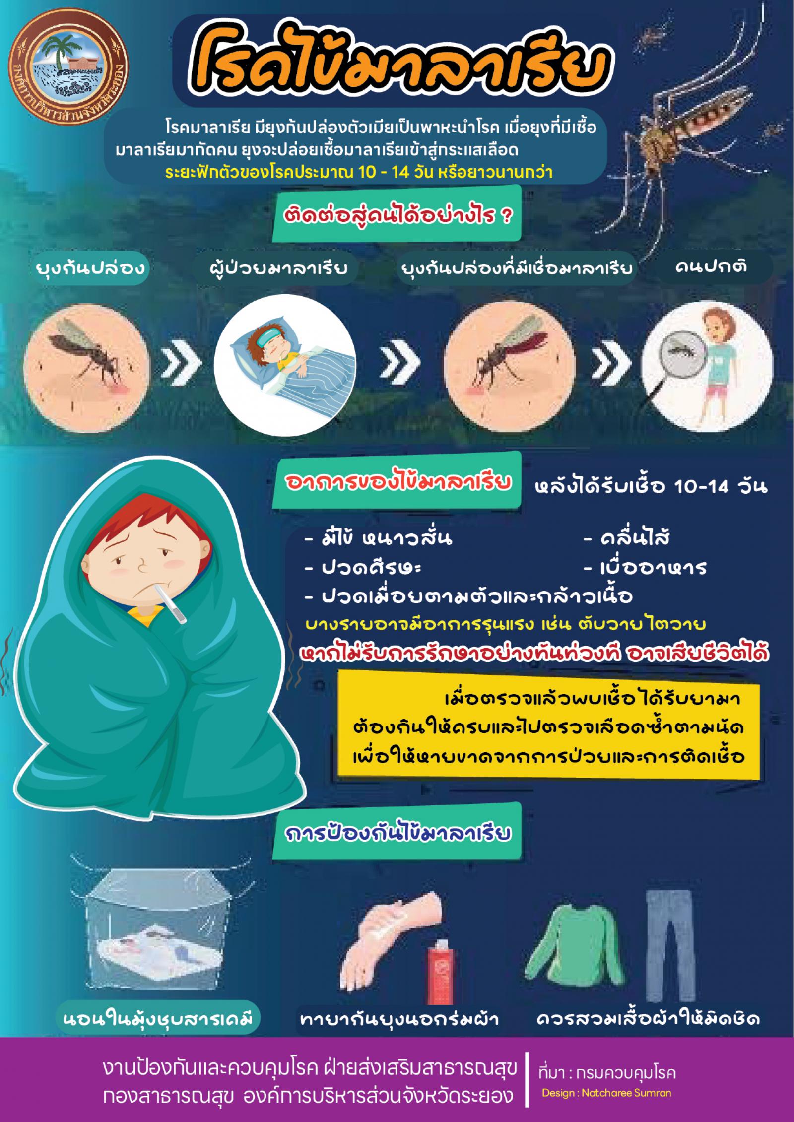 ด้วยสถานการณ์โรคไข้มาลาเรีย จังหวัดระยอง ปี พ.ศ. ๒๕๖๗ ข้อมูล ณ วันที่ ๑๕ กันยายน ๒๕๖๗ พบผู้ป่วยสะสม จำนวน ๑๔ ราย ซึ่งสูงกว่าปีที่ผ่านมา ๑.๕ เท่า ผู้ป่วยเป็นเพศชาย ๖ ราย เพศหญิง ๘ ราย อัตราส่วนเพศชายต่อเพศหญิงเท่ากับ ๑ : ๑.๓ พบผู้ป่วยสูงสุดในกลุ่มอายุ ๒๕ - ๔๔ ปี (ร้อยละ ๔๒.๘๕) รองลงมาคืออายุ ๑๕ - ๖๔ ปี (ร้อยละ ๒๑.๔๓) และ ๔๕ - ๖๔ ปี (ร้อยละ ๒๑.๔๓) ตามลำดับ ผู้ป่วยประกอบอาชีพรับจ้างสูงสุด รองลงมาคือนักเรียน และอื่นๆ ตามลำดับ โดยพบผู้ป่วยติดเชื้อโรคไข้มาลาเรียในพื้นที่ ได้แก่ ตำบลป่ายุบใน อำเภอวังจันทร์ (๔ ราย) และตำบลบางบุตร อำเภอบ้านค่าย (๔ ราย) ซึ่งต้องระวัง ป้องกัน และควบคุมโรคเพื่อกำจัดโรคไข้มาลาเรีย
