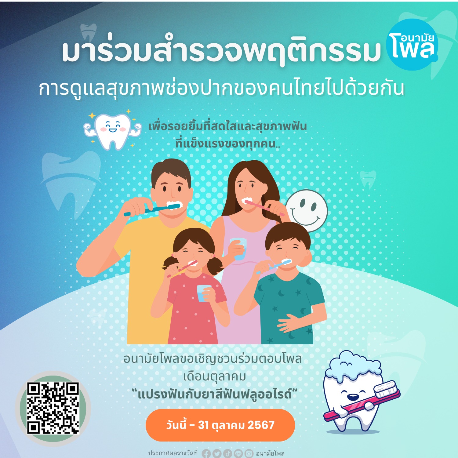 ด้วยจังหวัดระยอง มีหนังสือ ที่ รย ๐๐๓๓/ว๒๑๐๘๖ ลงวันที่ ๑๖ ตุลาคม ๒๕๖๗ แจ้งว่า กรมอนามัย โดยสำนักทันตสาธารณสุข ได้จัดการรณรงค์การแปรงฟันด้วยยาสีฟันผสมฟลูออไรด์ ตลอดปีงบประมาณ ๒๕๖๘ ในกิจกรรม Brush and Bright ส่งเสริมให้คนไทยมีสุขภาพช่องปากที่เอื้อต่อการมีคุณภาพชีวิตที่ดี และได้จัดทำการสำรวจ Anamai Poll ให้หัวข้อ “แปรงฟันกับยาสีฟันฟลูออไรด์” ทั้งนี้ จังหวัดระยอง โดยสำนักงานสาธารณสุขจังหวัด จึงขอความร่วมมือผู้ที่เกี่ยวข้องเชิญชวนให้ประชาชนทั่วไป ที่มีอายุตั้งแต่ ๑๘ ปีขึ้นไป เข้าร่วมตอบแบบสำรวจพฤติกรรมการดูแลสุขภาพช่องปากของคนไทย ตาม QR Code หรือทางเว็บไซด์ https://tally.so/r/w4o4kX ตั้งแต่วันนี้ถึงวันที่ ๓๑ ตุลาคม ๒๕๖๗