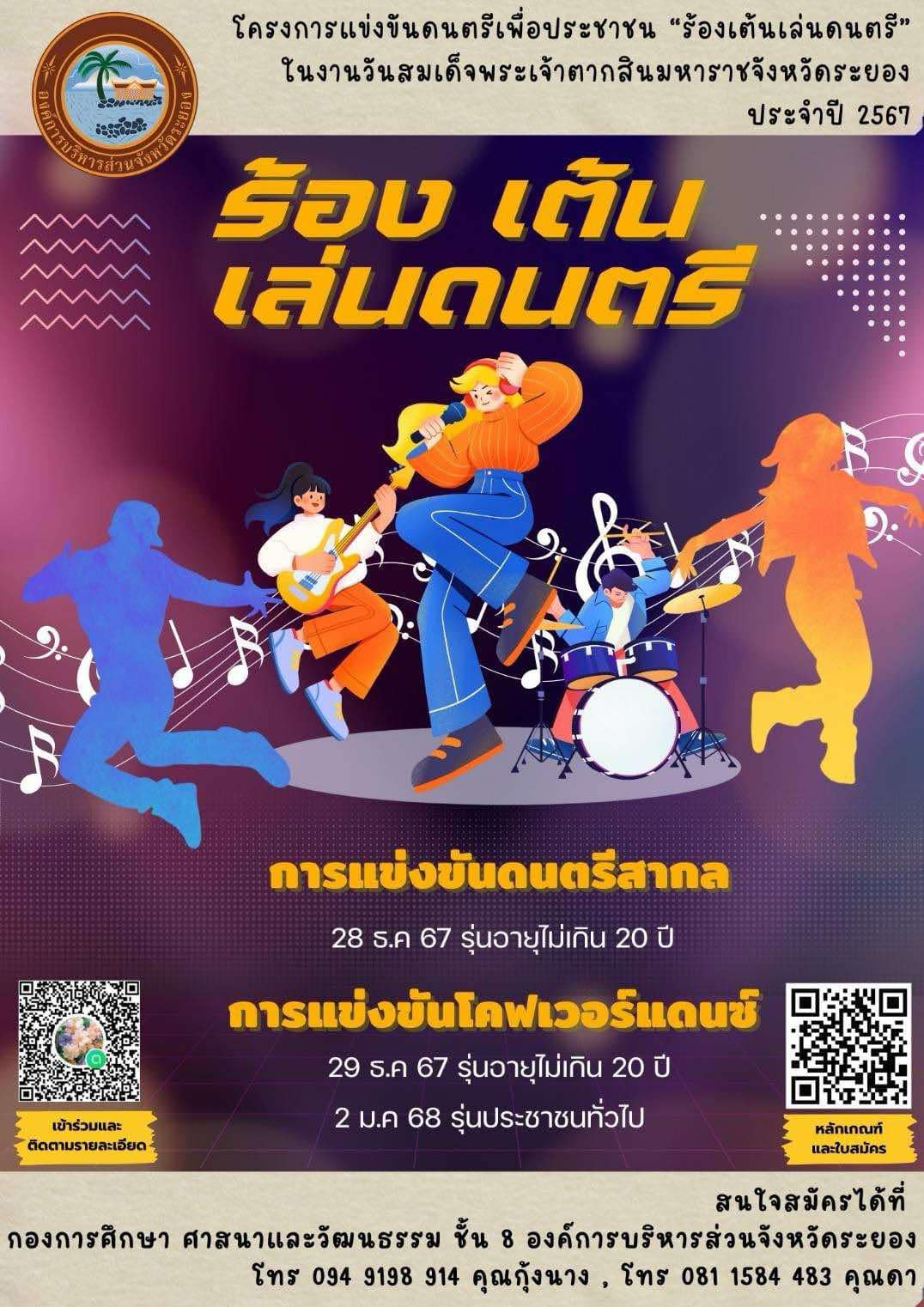โครงการแข่งขันดนตรีเพื่อประชาชน "ร้องเต้นเล่นดนตรี" ในงานวันสมเด็จพระเจ้าตากสินมหาราชจังหวัดระยอง ประจำปี ๒๕๖๘ ในระหว่างวันที่ ๒๘ ธันวาคม ๒๕๖๗ ถึง ๓ มกราคม ๒๕๖๘