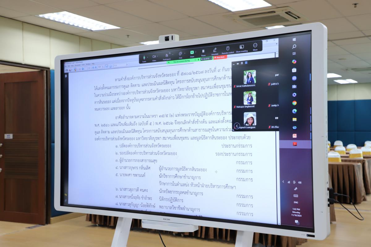 วันที่ 18 พฤศจิกายน 2567 เวลา 13.30 น. ได้จัดทำโครงการสนับสนุนทุนการศึกษาด้านสาธารณสุข ในความร่วมมือระหว่างองค์การบริหารส่วนจังหวัดระยอง มหาวิทยาลัยบูรพา สมาคมเพื่อนชุมชน และมูลนิธิ ตากสินระยอง โดยมีวัตถุประสงค์เพื่อสนับสนุนทุนการศึกษาให้กับนักเรียนในจังหวัดระยองในคณะ/หลักสูตร/ สาขาวิชาด้านสาธารณสุข ณ มหาวิทยาลัยบูรพา โดยมีนายสมเกียรติ ยุพาพิน รองปลัดองค์การบริหารส่วนจังหวัด เป็นประธานร่วมประชุมคณะกรรมการดูแล ติดตาม และประเมินผลนิสิตทุน โครงการสนับสนุนทุนการศึกษาด้านสาธารณสุข ในความร่วมมือระหว่างองค์การบริหารส่วนจังหวัดระยอง มหาวิทยาลัยบูรพา สมาคมเพื่อนชุมชน และมูลนิธิตากสินระยอง ผ่านสื่ออิเล็กทรอนิกส์ด้วยระบบ ZOOM meeting พร้อมทั้งหาแนวทางแก้ไขร่วมกัน ณ ห้องประชุม 3 ชั้น 3 อบจ.ระยอง