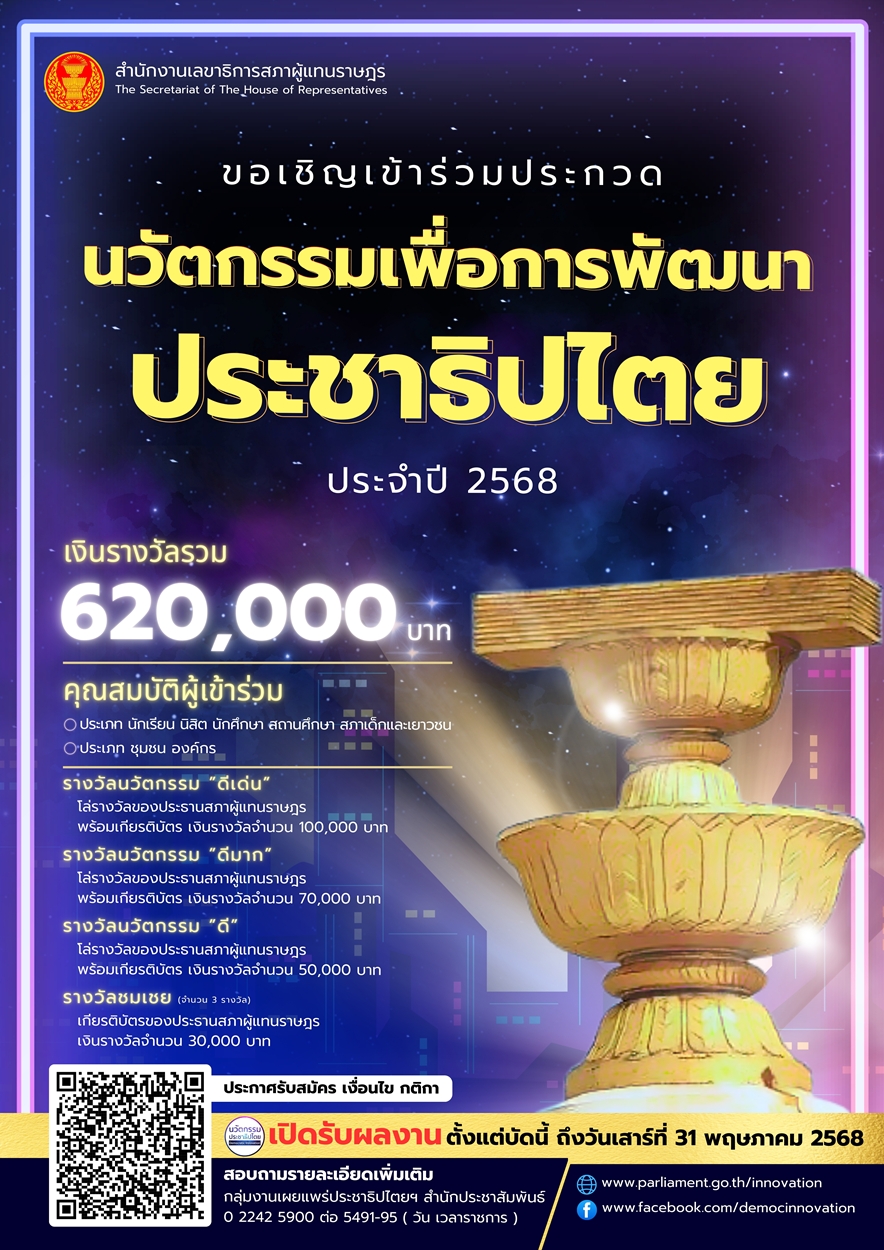 ขอเชิญเข้าร่วมโครงการประกวดนวัตกรรมประชาธิปไตยเพื่อพัฒนาประชาธิปไตยเชิงคุณภาพ ประจำปี ๒๕๖๘