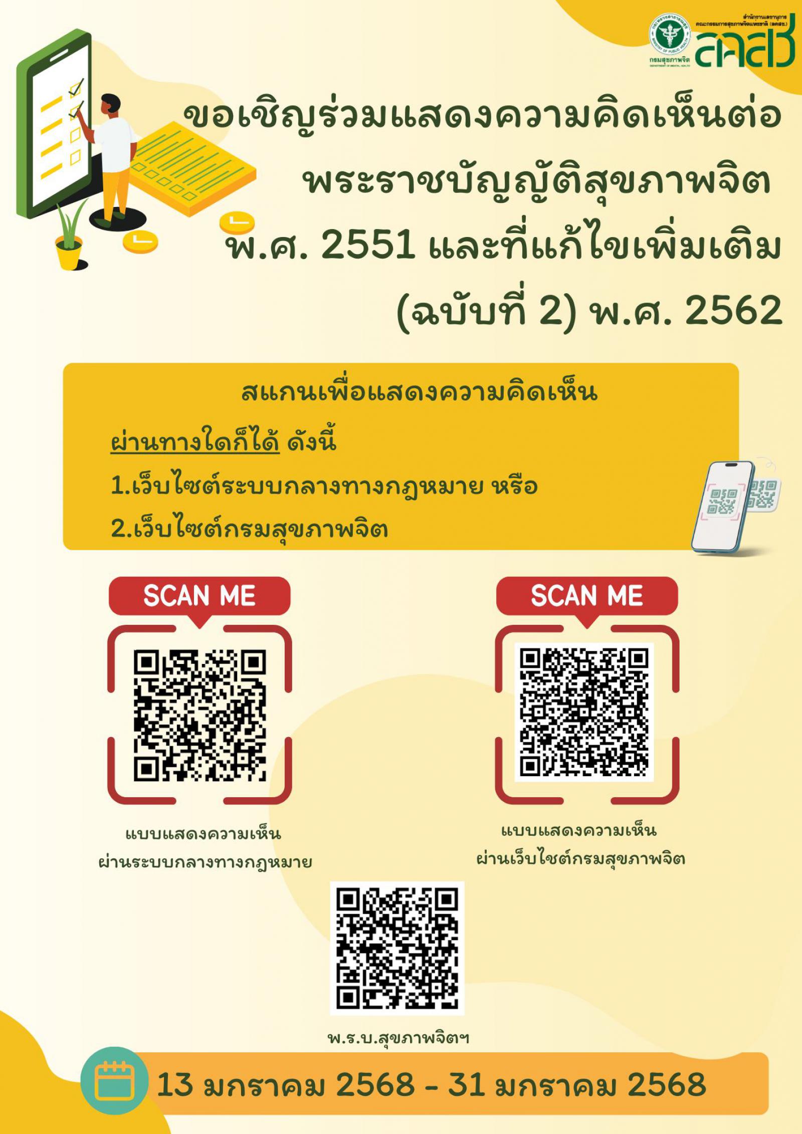 ร่วมแสดงความคิดเห็นต่อพระราชบัญญัติสุขภาพจิต พ.ศ. ๒๕๕๑ และที่แก้ไขเพิ่มเติม (ฉบับที่ ๒) พ.ศ. ๒๕๖๒ ผ่านระบบกลางทางกฎหมาย (http://law.go.th) หรือเว็บไซต์กรมสุขภาพจิต http://dmh.go.th/