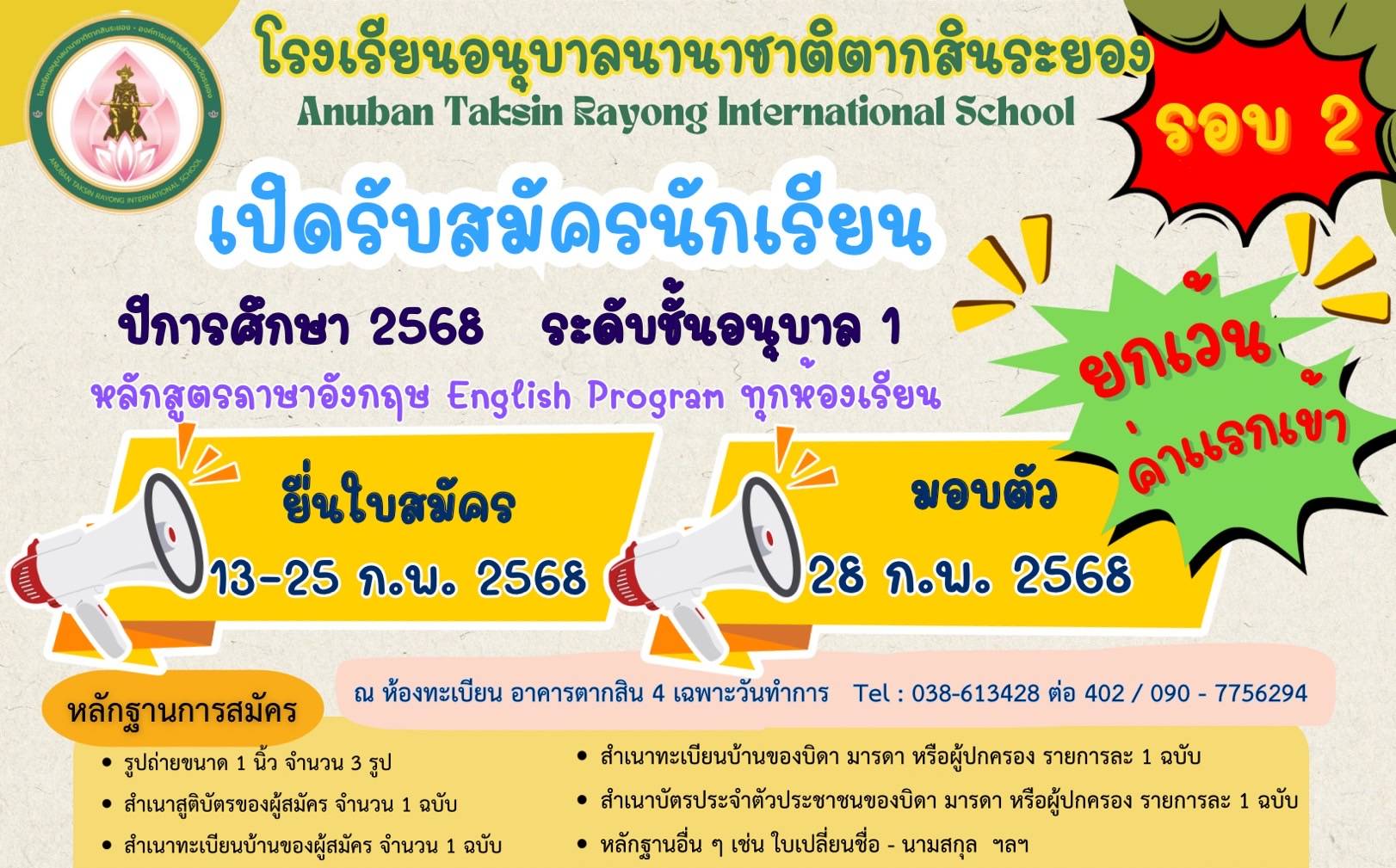 ประกาศการรับสมัครนักเรียนเข้าใหม่ ประจำปีการศึกษา ๒๕๖๘ ของโรงเรียนนานาชาติตากสินระยอง