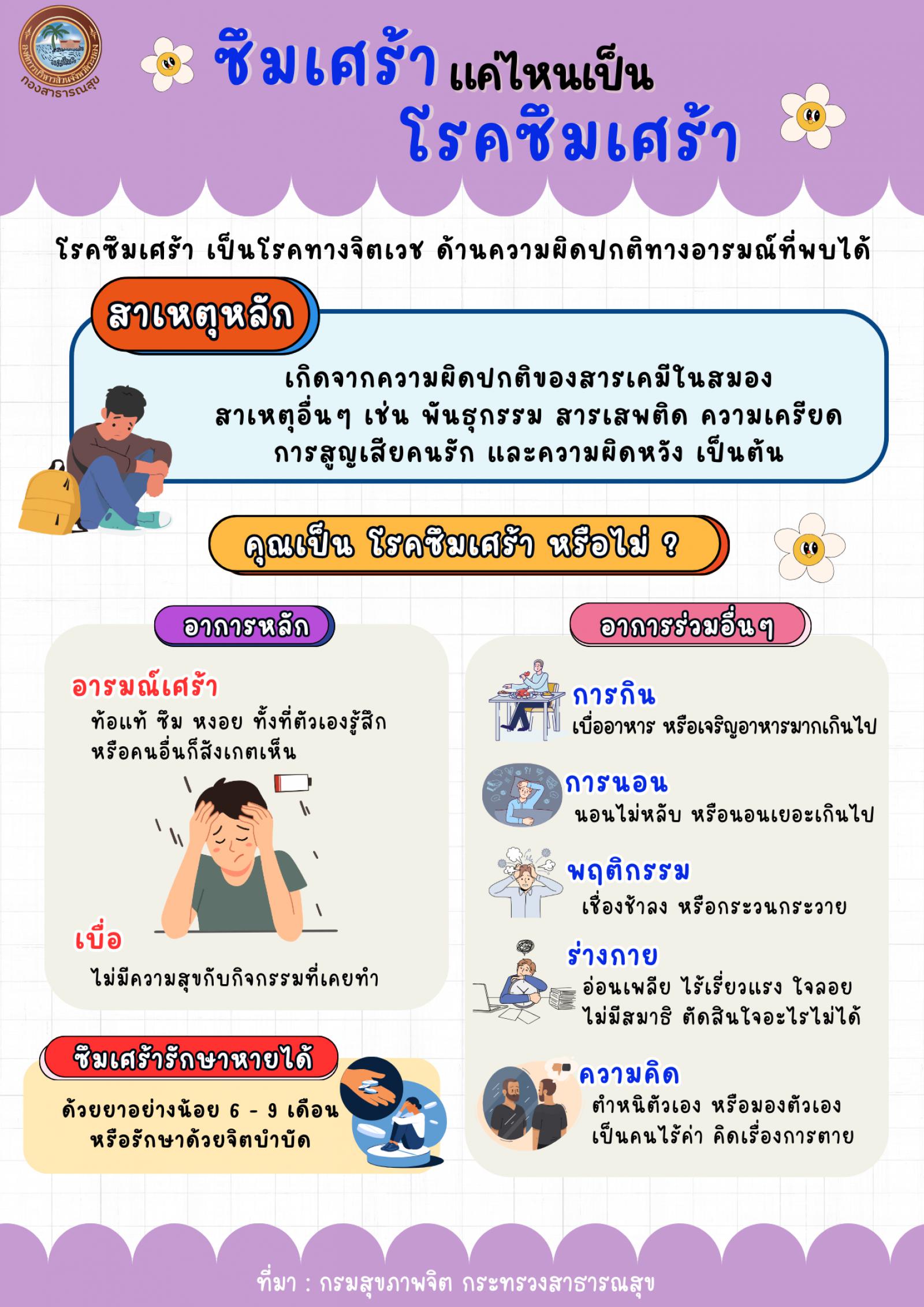 ต่อชีวิตประจำวัน แต่อาการของภาวะซึมเศร้า มักจะไม่รุนแรงเท่าโรคซึมเศร้า และเกิดขึ้นชั่วคราวเท่านั้น หากเริ่มมีอาการผิดปกติควรเข้ารับการปรึกษาจากจิตแพทย์โดยเร่งด่วน ซึ่งโรคซึมเศร้าสามารถรักษาหายได้ด้วยยา อย่างน้อย 6 - 9 เดือน หรือรักษาด้วยจิตบำบัด รายละเอียดตามเอกสารที่แนบมาพร้อมนี้
