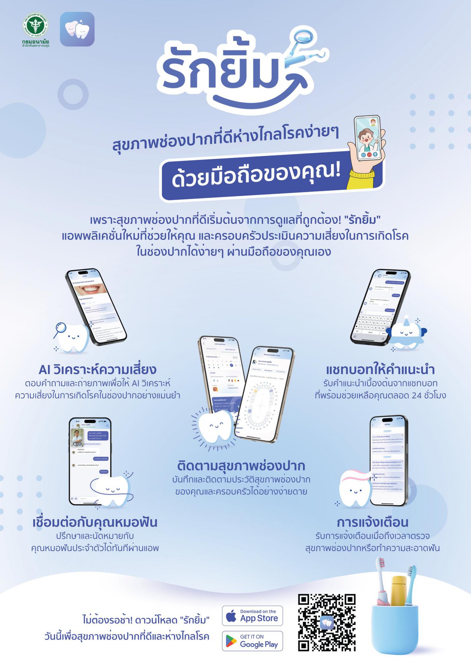 ด้วยกรมอนามัย มีหนังสือ ที่ สธ 0904.08/ว497 ลงวันที่ 6 กุมภาพันธ์ 2568 แจ้งว่า กรมอนามัย ได้จัดประชุมเชิงปฏิบัติการพัฒนาศักยภาพการใช้งานและบริหารจัดการดิจิทัลแพลตฟอร์ม เพื่อเสริมสร้างศักยภาพและยกระดับการพัฒนาระบบเฝ้าระวังทันตสุขภาพประชาชนทุกกลุ่มวัย ส่งเสริมให้มีการใช้ประโยชน์ของข้อมูลสารสนเทศยุคดิจิทัลอย่างครอบคลุมและทั่วถึง และเพื่อแนะนำและฝึกปฏิบัติใช้งาน “แอพพลิเคชั่น รักยิ้ม” ในการนี้ กรมอนามัยจึงขอประชาสัมพันธ์ รักยิ้ม Application เพื่อให้ประชาชนทุกกลุ่มวัยเข้าถึงบริการด้านสุขภาพช่องปากผ่านดิจิทัลแพลตฟอร์ม รายละเอียดตามเอกสารที่แนบมาพร้อมนี้