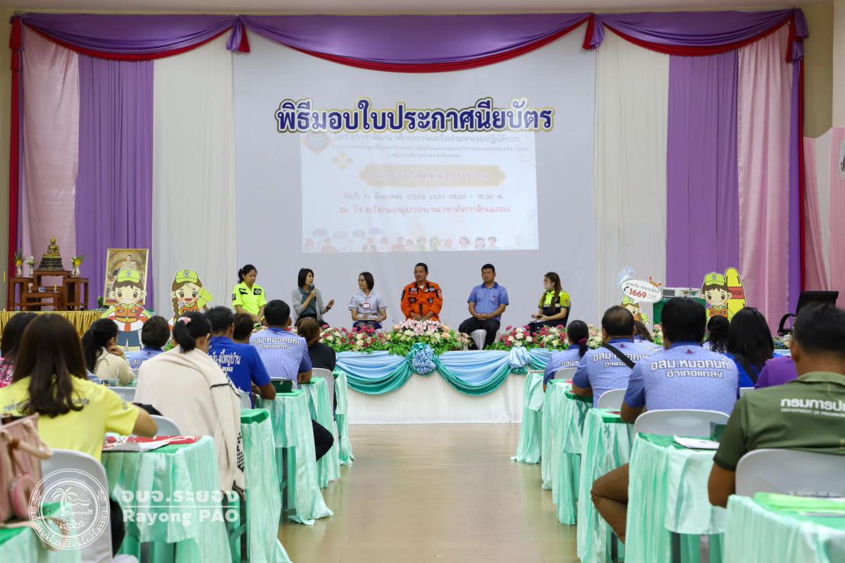 วันที่ 11 มีนาคม 2568 เวลา 09.00 น. กองสาธารณสุข จัดโครงการพัฒนาศักยภาพเครือข่ายหน่วยปฏิบัติงานด้านการแพทย์ฉุกเฉินจังหวัดระยอง ศูนย์รับแจ้งเหตุและจ่ายงานการแพทย์ฉุกเฉิน (1669) องค์การบริหารส่วนจังหวัดระยอง ซึ่งเป็นการอบรมภาคประชาชนของอำเภอแกลง โดยมีนายกันตภณ สุขสงค์ นายอำเภอแกลง เป็นประธานในพิธีเปิดโครงการฯ โดยกิจกรรมภายในโครงการฯได้มีการบรรยายจากนางสาวสุชารีย์ หิรัญศรี แพทย์เวชศาสตร์ฉุกเฉิน โรงพยาบาลระยอง ในหัวข้อ ”การประเมินและคัดแยกผู้ป่วยฉุกเฉินกับภาวะฉุกเฉินที่พบบ่อยและการดูแลเบื้องต้น“ การเสวนาในหัวข้อ “เสียงสะท้อนการแพทย์ฉุกเฉินในปัจจุบันสู่อนาคตที่มุ่งหมาย” กิจกรรมแบ่งกลุ่ม และการมอบเกียรติบัตรแก่ผู้เข้าอบรม ณ หอประชุมโรงเรียนนานาชาติตากสินแกลง